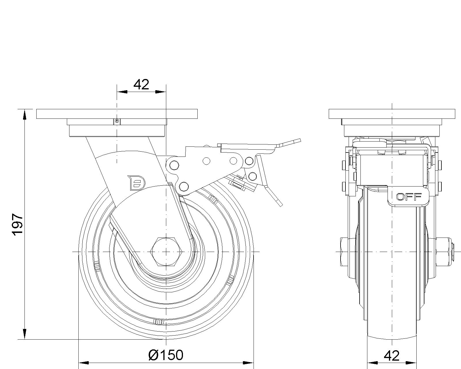 | Bánh xe PU (vòng cung đỏ) Đường kính bánh xe × Chiều rộng bánh xe 150x 42mm |