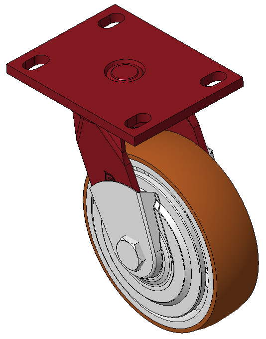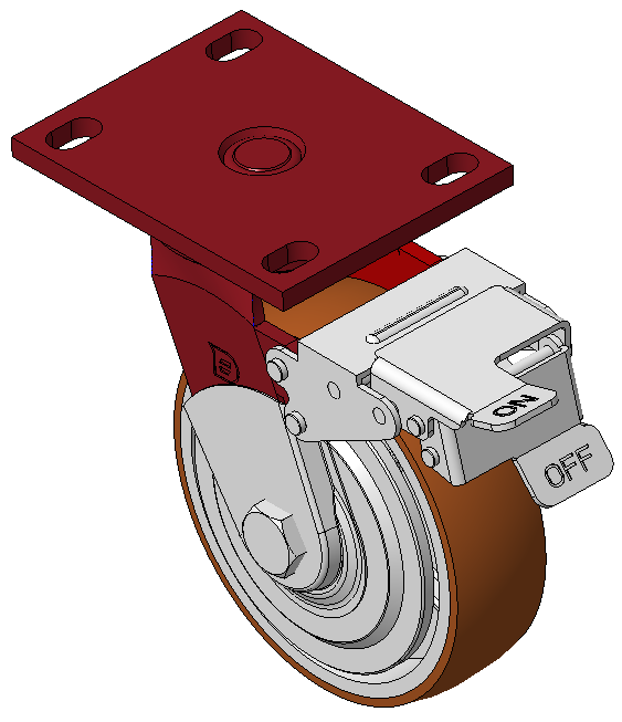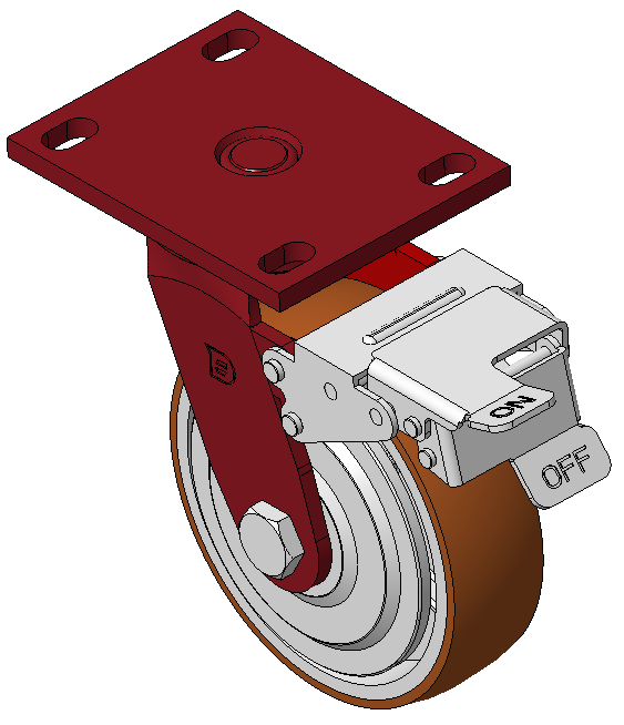 Đặc điểm: Phanh trước, bánh xe có khóa; khung thép hàn. Sơn màu đỏ; lắp đặt bằng tấm đế; khoảng cách lỗ 110x75mm. Trục bánh xe bằng gang; bề mặt bánh xe bằng polyurethane chất lượng cao; hoàn thiện màu nâu phay. Vòng bi bánh xe—vòng bi cầu chính xác. |