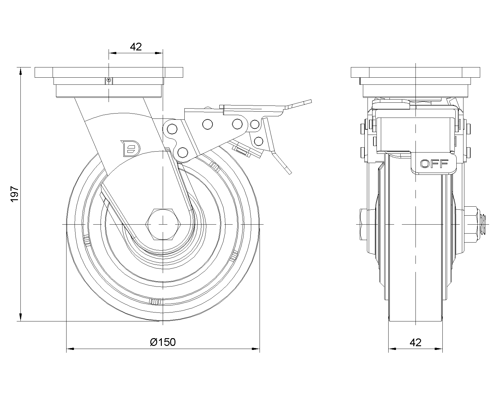 | Bánh xe có hệ thống phanh và khóa bánh trước, khung thép hàn Sơn đỏ, lắp đế, khoảng cách lỗ 85x70 Lõi bánh xe bằng gang, gai polyurethane chất lượng cao, phay màu đỏ Ổ bi bánh xe—ổ bi chính xác với nắp bánh xe chống quấn đặc biệt |