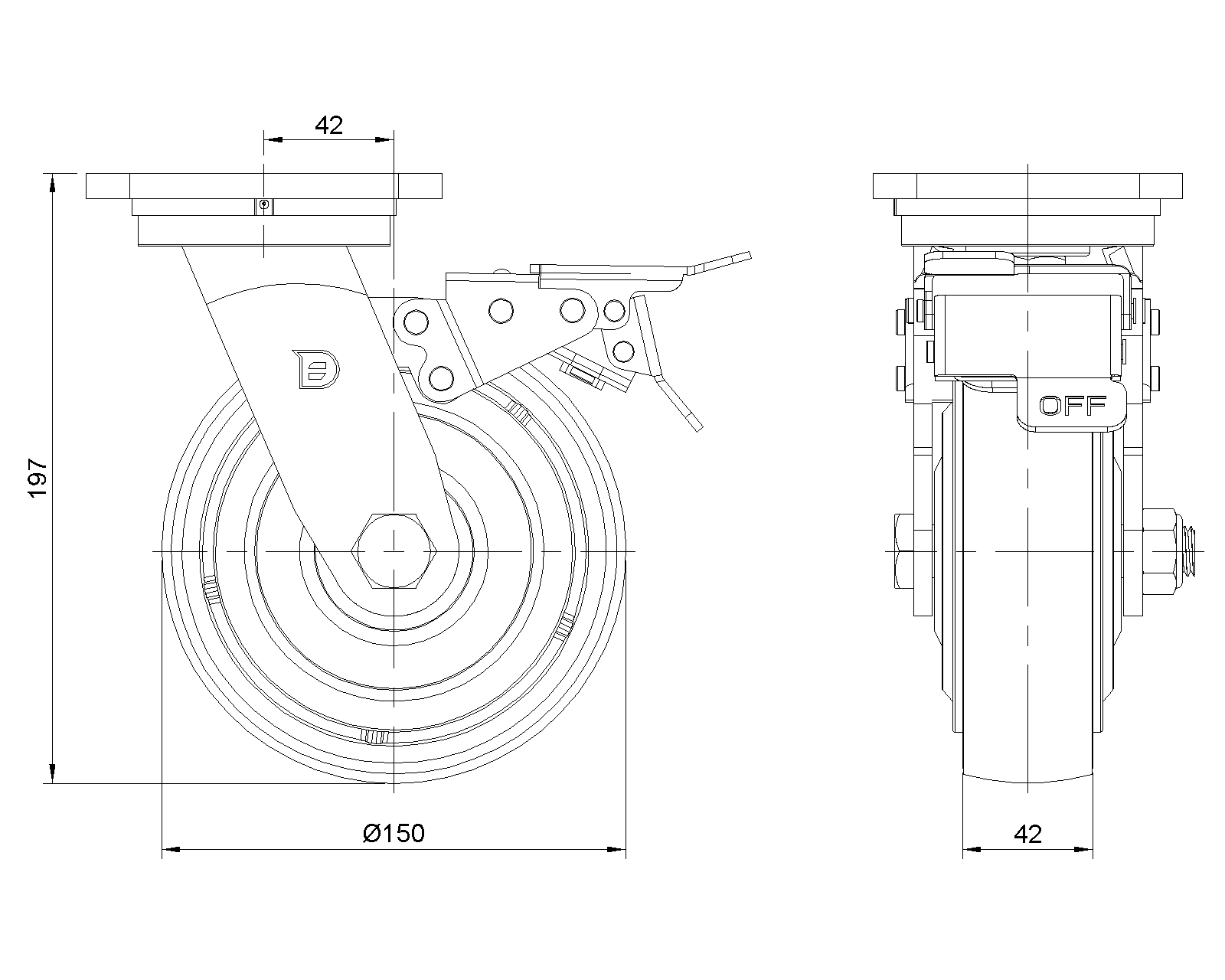 | Bánh xe PU (vòng cung đỏ) Đường kính bánh xe × Chiều rộng bánh xe 150x 42mm |