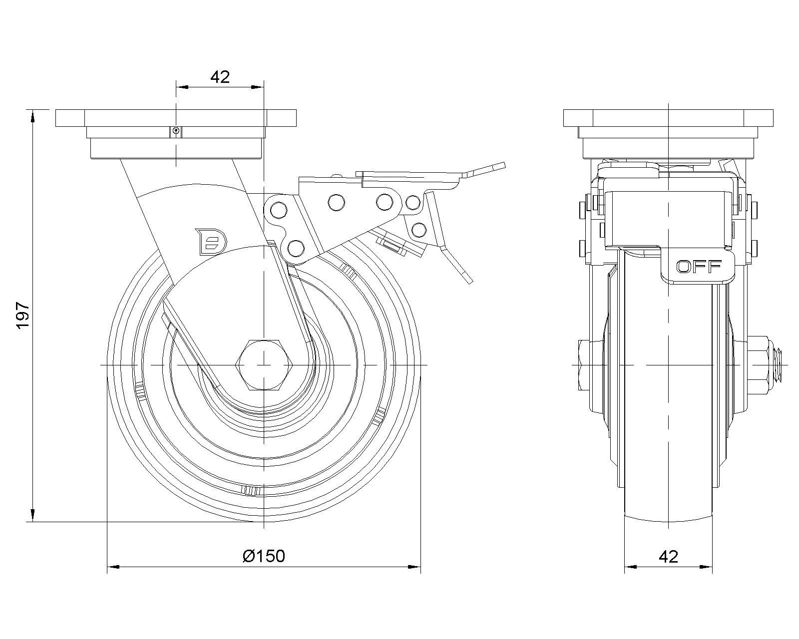 | Bánh xe PU (vòng cung đỏ) Đường kính bánh xe × Chiều rộng bánh xe 150x 42mm |