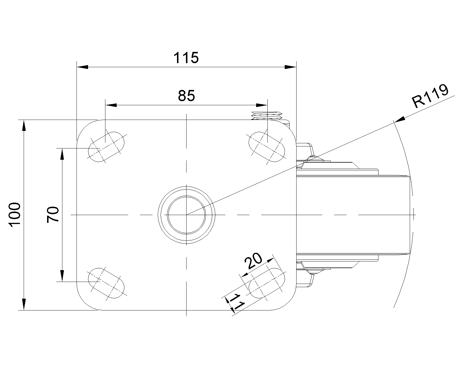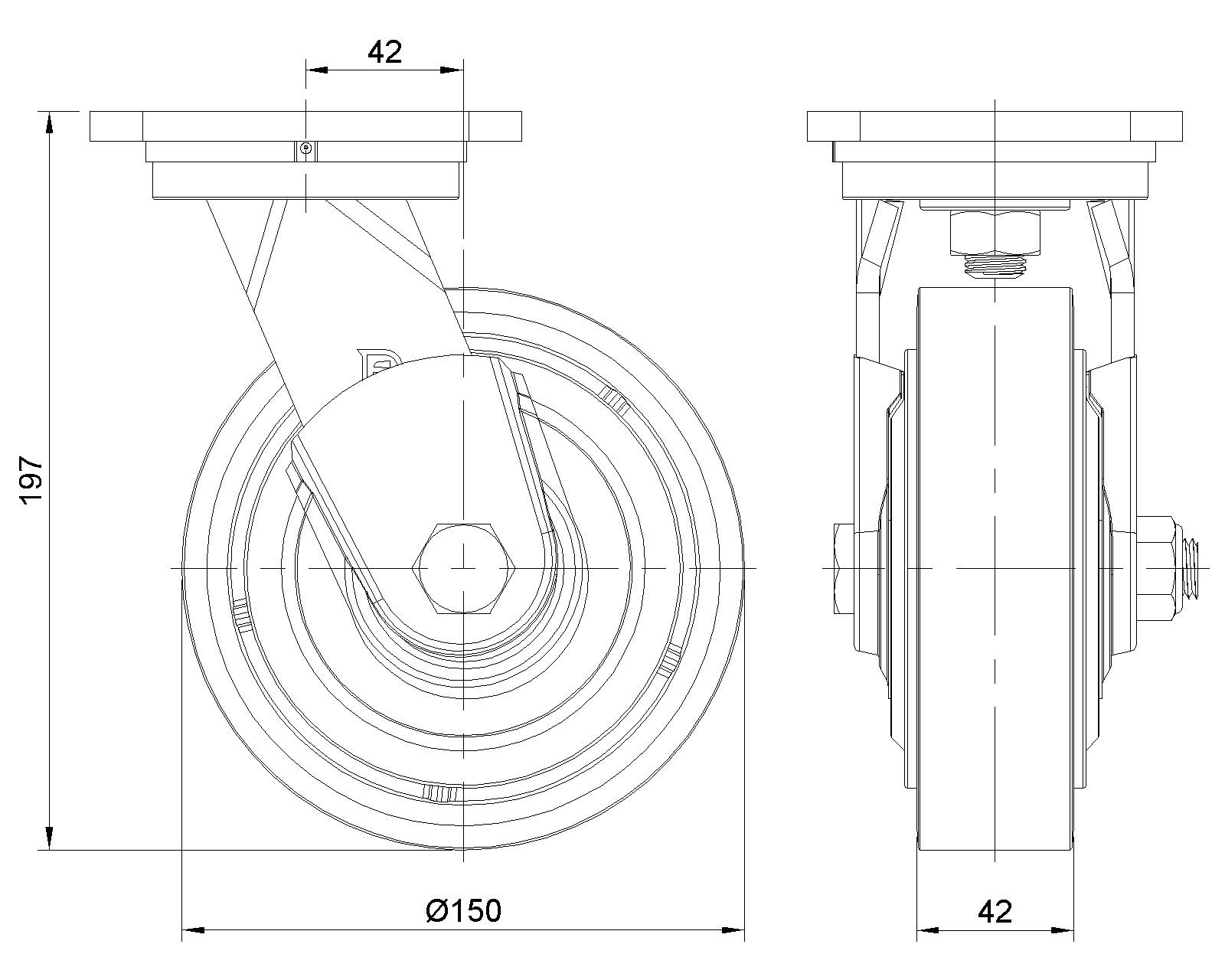 Bánh xe xoay với khung thép hàn, sơn phủ màu đỏ Lắp đế, khoảng cách lỗ 85x70 Lõi bánh xe bằng gang, gai polyurethane chất lượng cao, phay màu đỏ Vòng bi bánh xe—vòng bi chính xác với nắp bánh xe chống quấn đặc biệt |