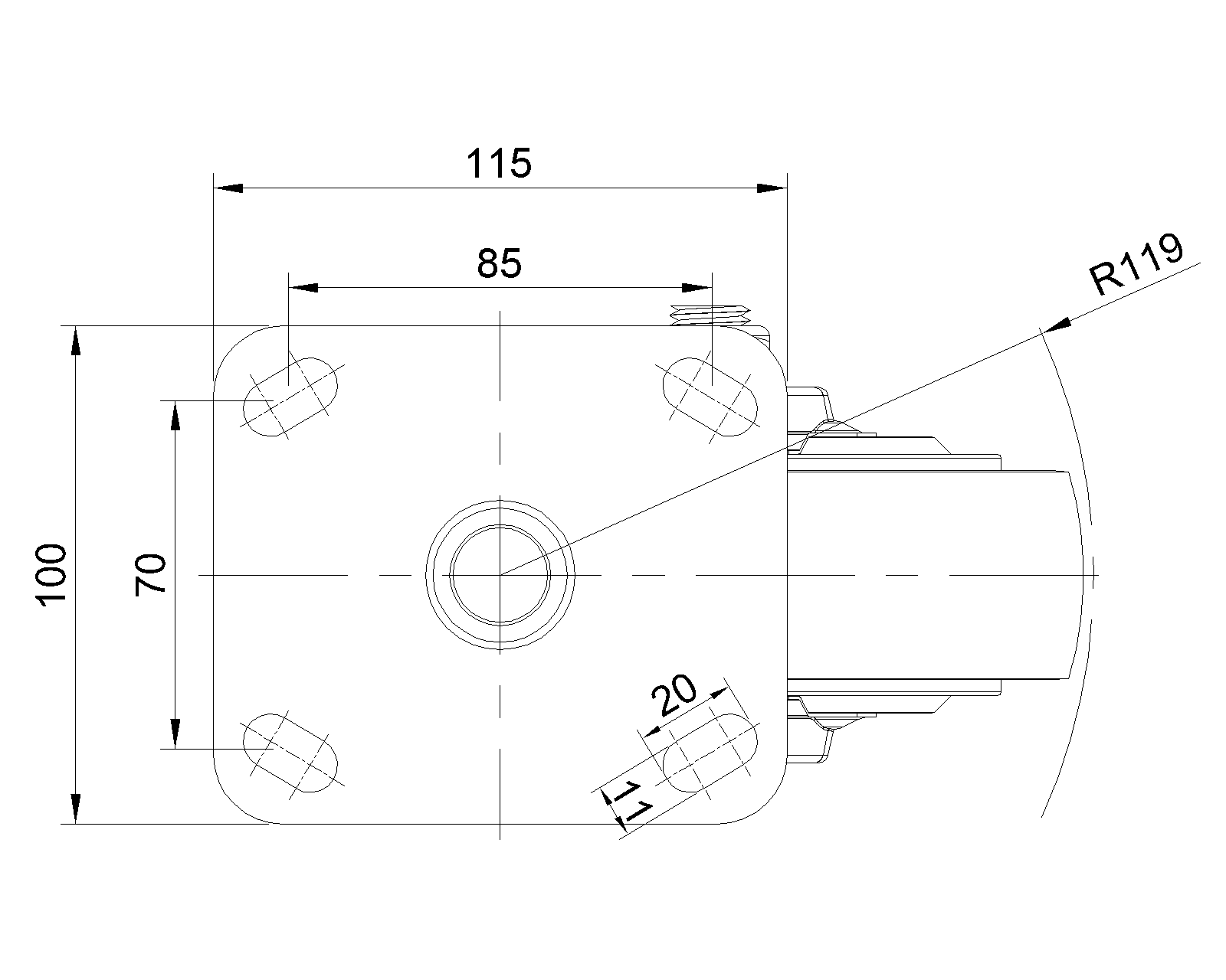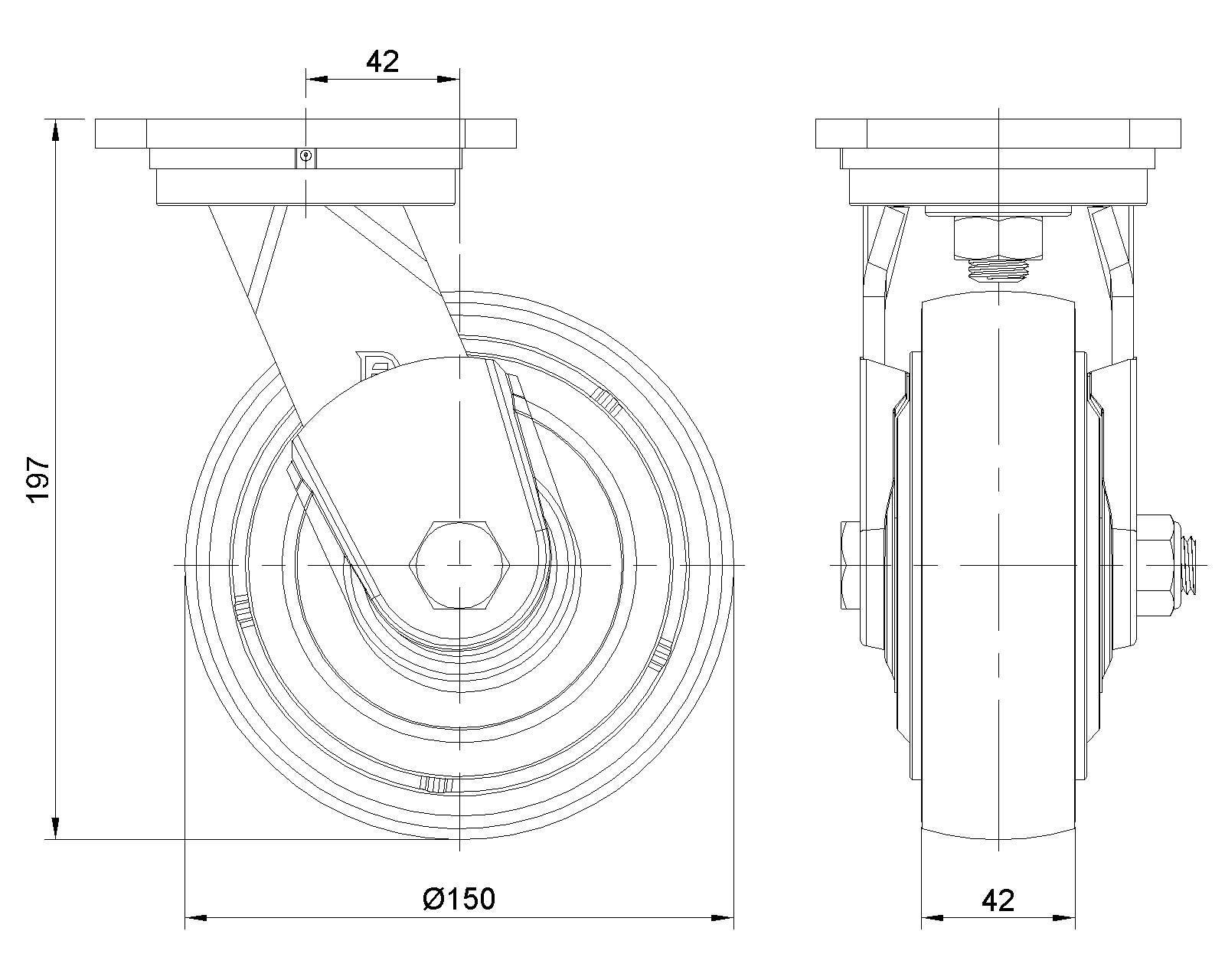 Bánh xe xoay với khung thép hàn, sơn phủ màu đỏ Lắp đế, khoảng cách lỗ 85x70 Lõi bánh xe bằng gang với gai polyurethane chất lượng cao, phay màu đỏ Vòng bi bánh xe—vòng bi chính xác với nắp bánh xe chống quấn đặc biệt |