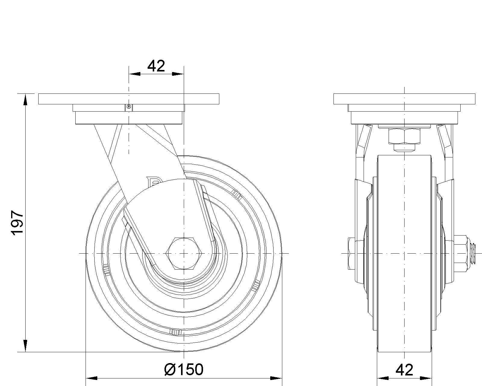 Thiết bị gắn đế, khoảng cách lỗ 110x75mm Lõi bánh xe bằng gang, bề mặt bánh xe bằng polyurethane chất lượng cao, sơn màu đỏ Vòng bi bánh xe—vòng bi cầu chính xác, được trang bị nắp chống xoắn đặc biệt |