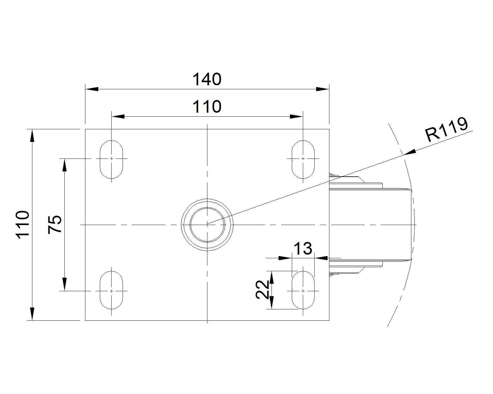 Quy cách tấm lắp 140 x 110mm khoảng cách các lỗ trên tấm nền 110x75mm Khoảng cách các lỗ lắp 22 x 13mm Độ lệch tâm 42mm Sự can thiệp quay 238mm Tổng chiều cao 197mm Bán kính xoay 119mm Độ cứng 93±5° Shore A Tải trọng (động) 410kgs |