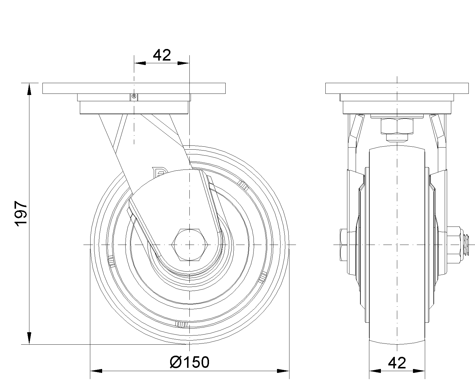 Thiết bị gắn đế, khoảng cách lỗ 110x75mm Lõi bánh xe bằng gang, bề mặt bánh xe bằng polyurethane chất lượng cao, màu nâu phay Vòng bi bánh xe—vòng bi cầu chính xác, được trang bị nắp chống xoắn đặc biệt |