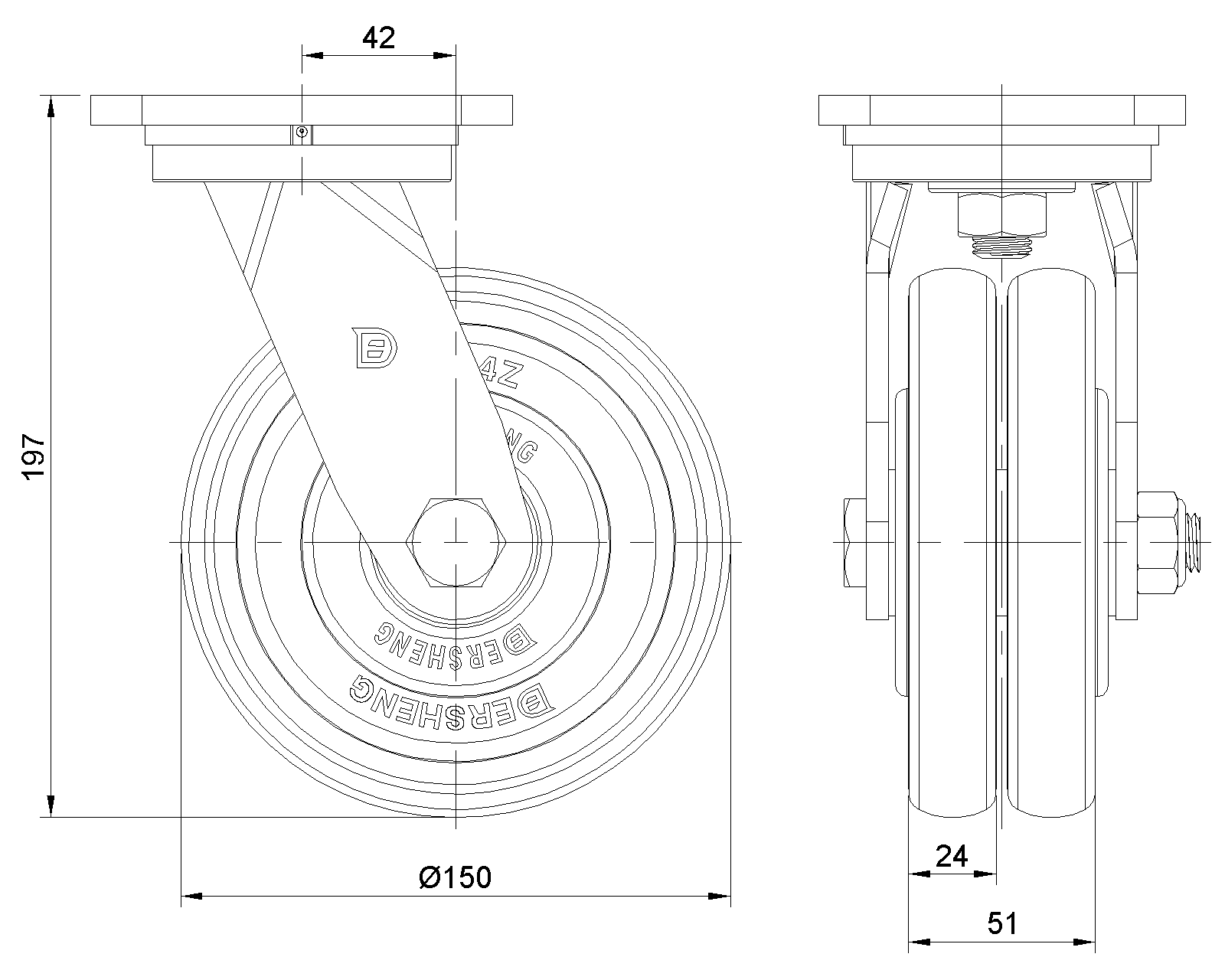 | Bánh xe ZQPU (hồ quang nâu) Đường kính bánh xe × Chiều rộng bánh xe 150 x 24 (51) mm |
