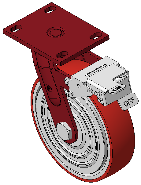Đặc điểm: Phanh trước, bánh xe có hệ thống khóa Sơn màu đỏ, lắp đặt bằng tấm đế, khoảng cách lỗ 110x75mm Lõi bánh xe bằng gang, bề mặt bánh xe bằng polyurethane chất lượng cao, được phay màu đỏ Vòng bi bánh xe—vòng bi cầu chính xác |