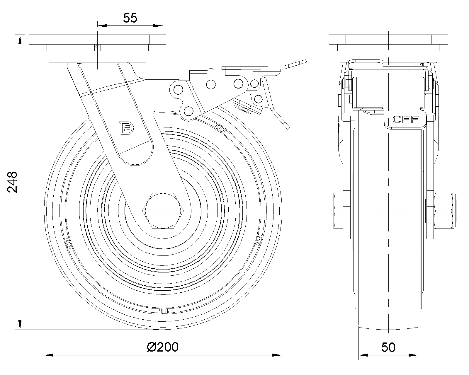 | Bánh xe PU (vòng cung đỏ) Đường kính bánh xe × Chiều rộng bánh xe 200 x 50mm |