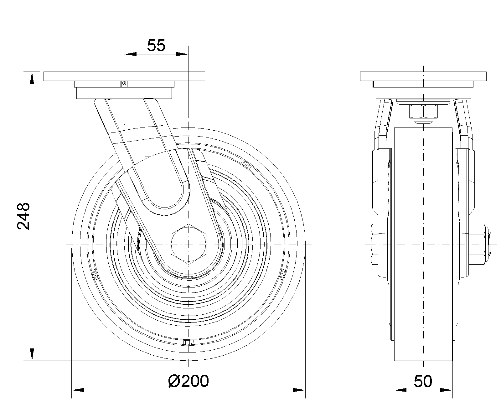 Thiết bị gắn đế, khoảng cách lỗ 110x75mm Lõi bánh xe bằng gang, bề mặt bánh xe bằng polyurethane chất lượng cao, màu đỏ Vòng bi bánh xe—vòng bi cầu chính xác, được trang bị nắp chống xoắn đặc biệt |