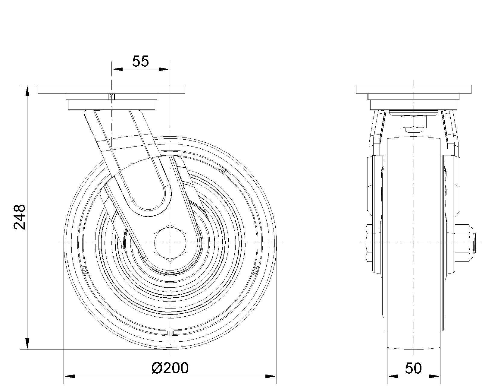 Thiết bị gắn đế, khoảng cách lỗ 110x75mm Lõi bánh xe bằng gang, bề mặt bánh xe bằng polyurethane chất lượng cao, màu nâu phay Vòng bi bánh xe—vòng bi cầu chính xác, được trang bị nắp chống xoắn đặc biệt |