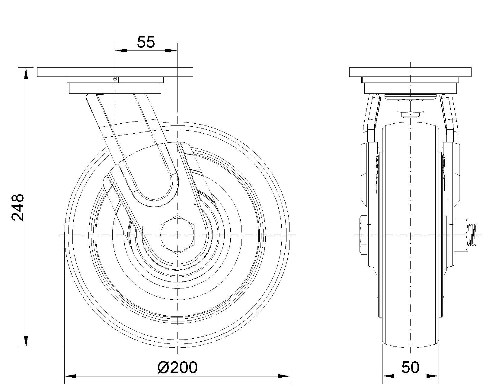 Thiết bị lắp đặt tấm đế, khoảng cách lỗ 110 x 75 Lõi bánh xe bằng nhựa nhiệt dẻo, màu bề mặt bánh xe tự nhiên Vòng bi bánh xe—vòng bi cầu chính xác, được trang bị nắp chống xoắn đặc biệt |