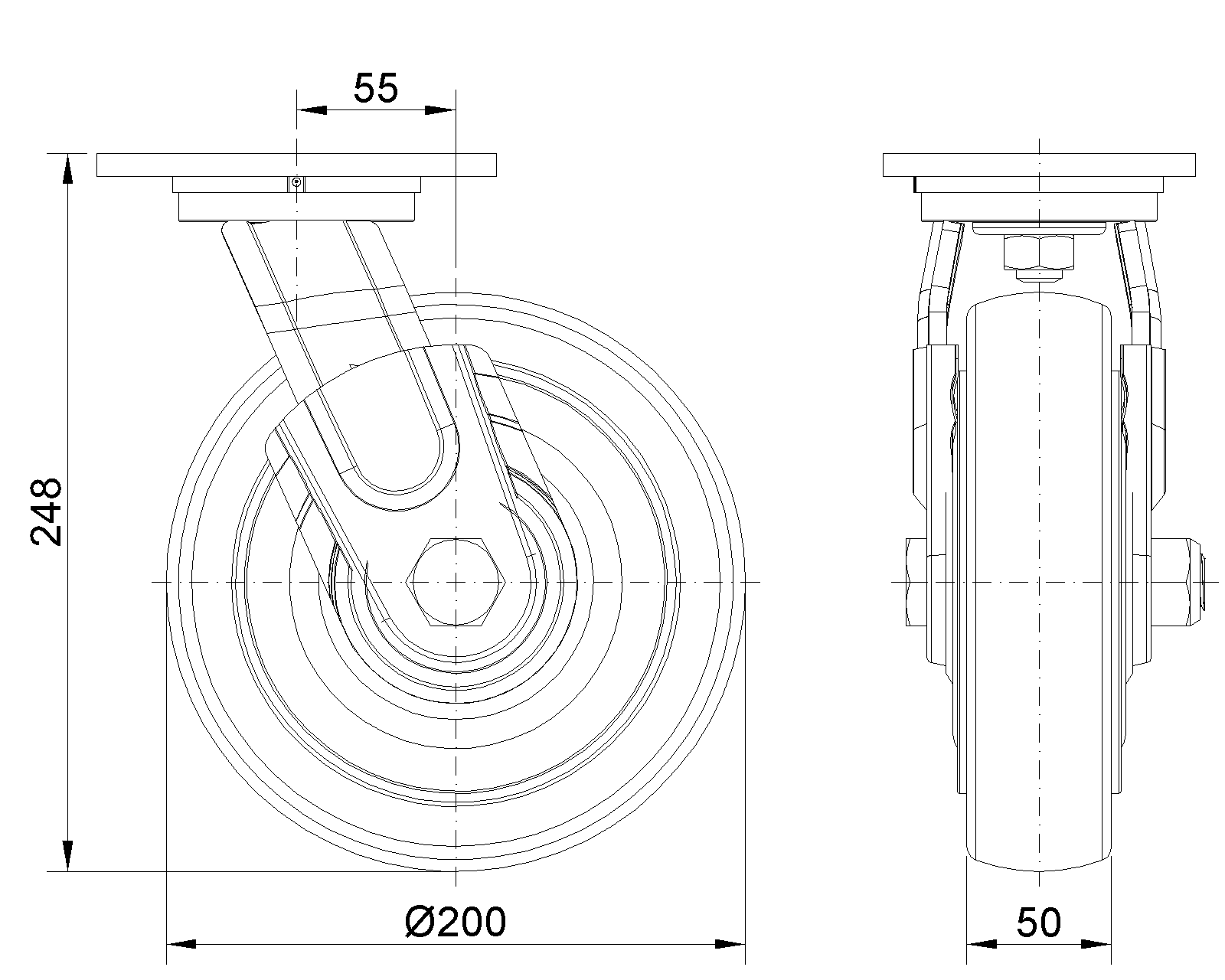 Thiết bị lắp đặt tấm đế, khoảng cách lỗ 110 x 75 Lõi bánh xe bằng gang, bề mặt bánh xe bằng polyurethane chất lượng cao, màu nâu phay Vòng bi bánh xe—vòng bi cầu chính xác, được trang bị nắp chống xoắn đặc biệt |