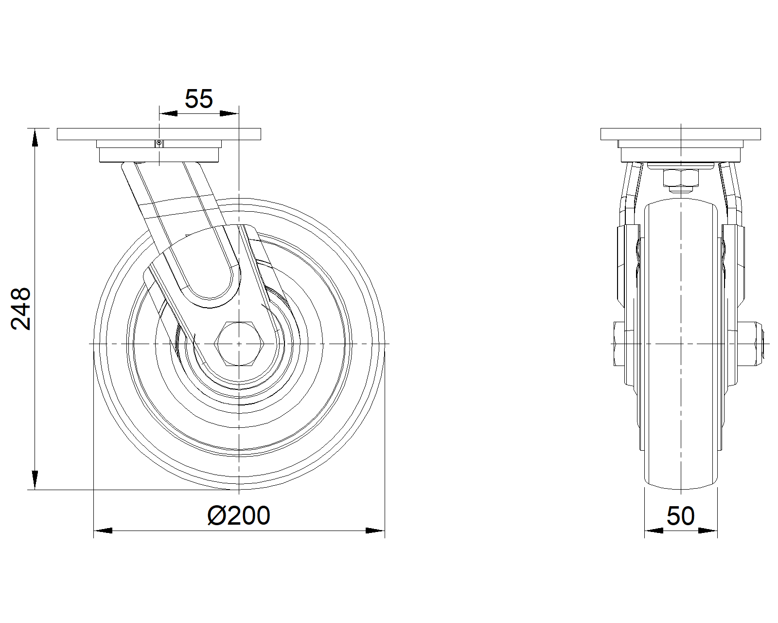 Lắp đế, khoảng cách lỗ 110 x 75 Lõi gang, mặt lốp polyurethane chất lượng cao, phay màu nâu Vòng bi bánh xe—vòng bi chính xác với nắp chống quấn đặc biệt |