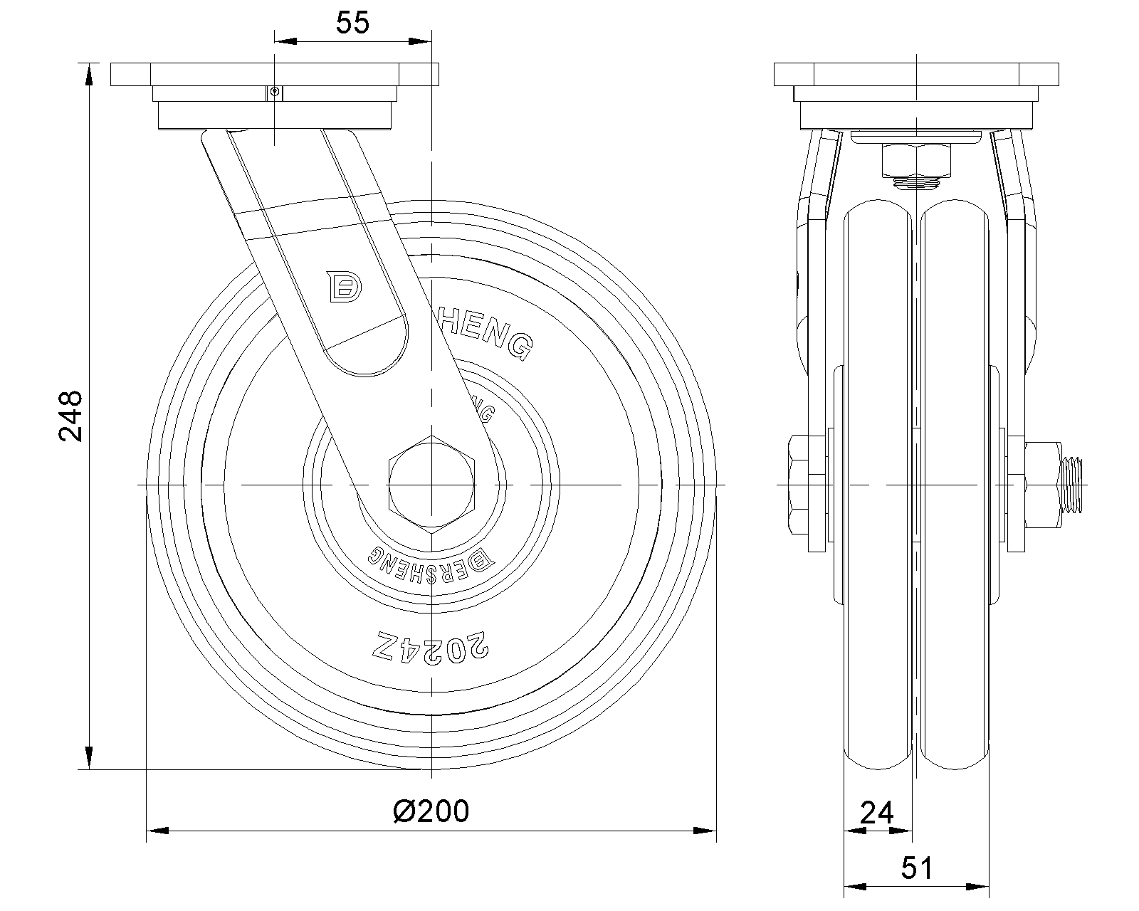 | Bánh xe ZQPU (hồ quang nâu) Đường kính bánh xe × Chiều rộng bánh xe 200 x 24 (51) mm |