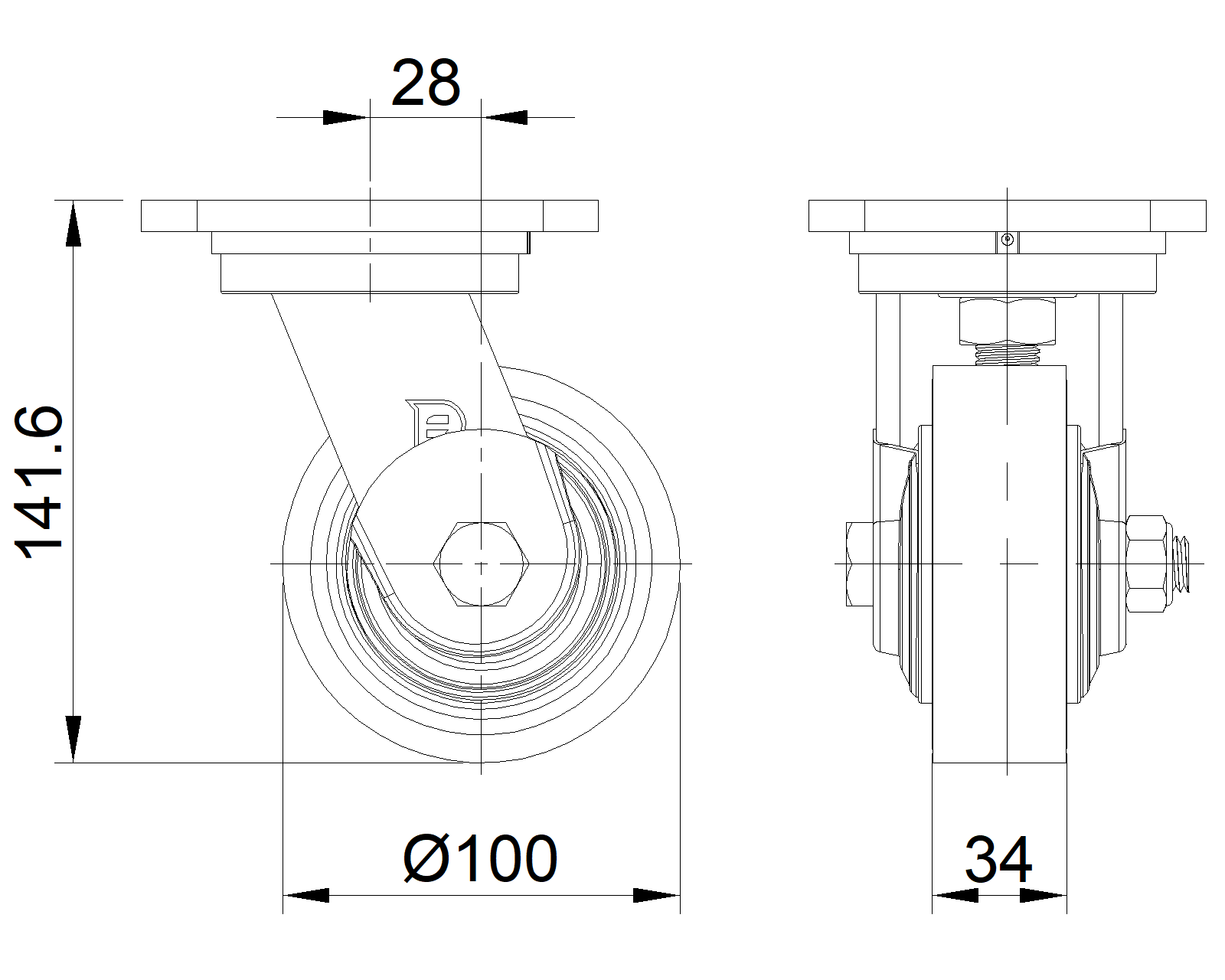 | Bánh PU (bánh phẳng màu đỏ) đường kính bánh × chiều rộng bánh 100 × 34 mm |