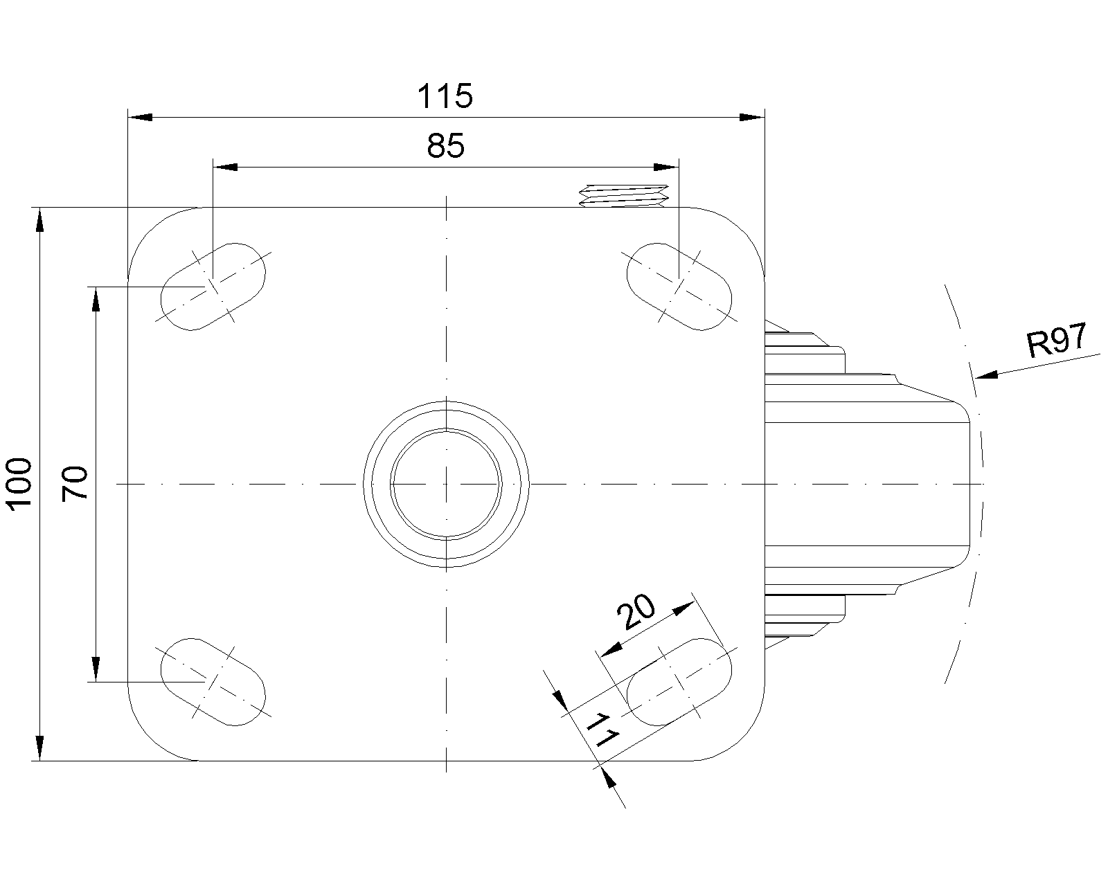 Quy cách tấm lắp 110 x 100mm khoảng cách các lỗ trên tấm nền 85 x 70mm Khoảng cách các lỗ lắp 20 x 11mm Độ lệch tâm 32mm Sự can thiệp quay 194mm Tổng chiều cao 165mm Bán kính xoay 97mm Độ cứng 85±5° Shore A Tải trọng (động) 250kgs  |