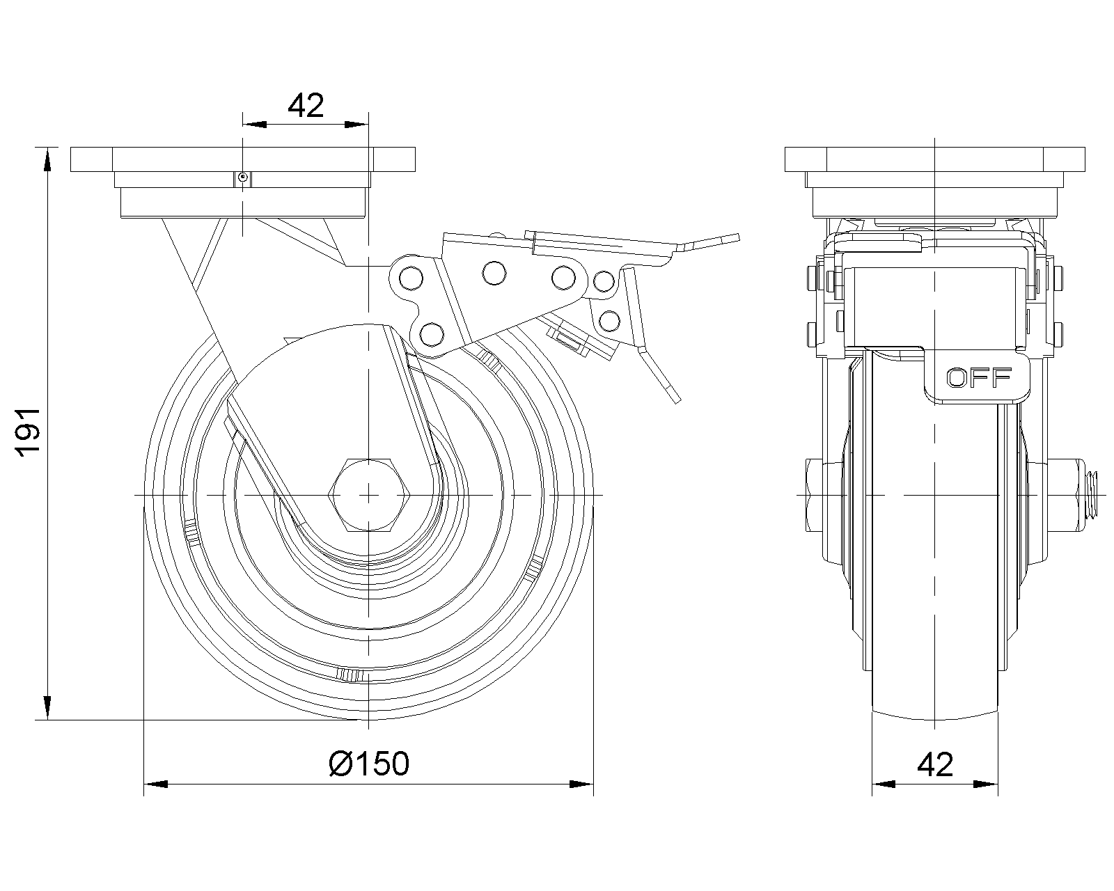 | Bánh xe PU (vòng cung đỏ) Đường kính bánh xe × Chiều rộng bánh xe 150x 42mm |
