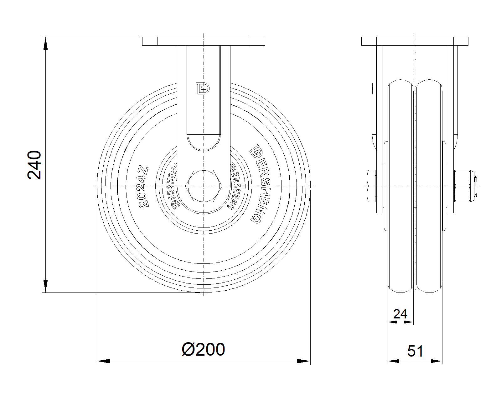 | Bánh xe ZQPU (hồ quang nâu) Đường kính bánh xe × Chiều rộng bánh xe 200 x 24 (51) mm |