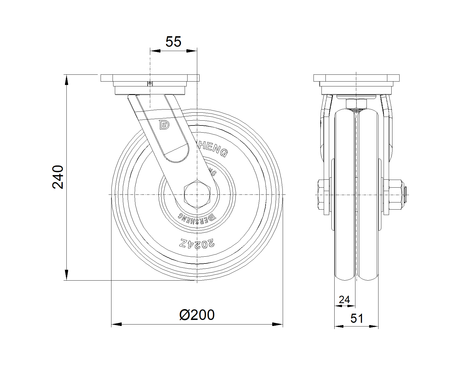 | Bánh xe ZQPU (hồ quang nâu) Đường kính bánh xe × Chiều rộng bánh xe 200 x 24 (51) mm |