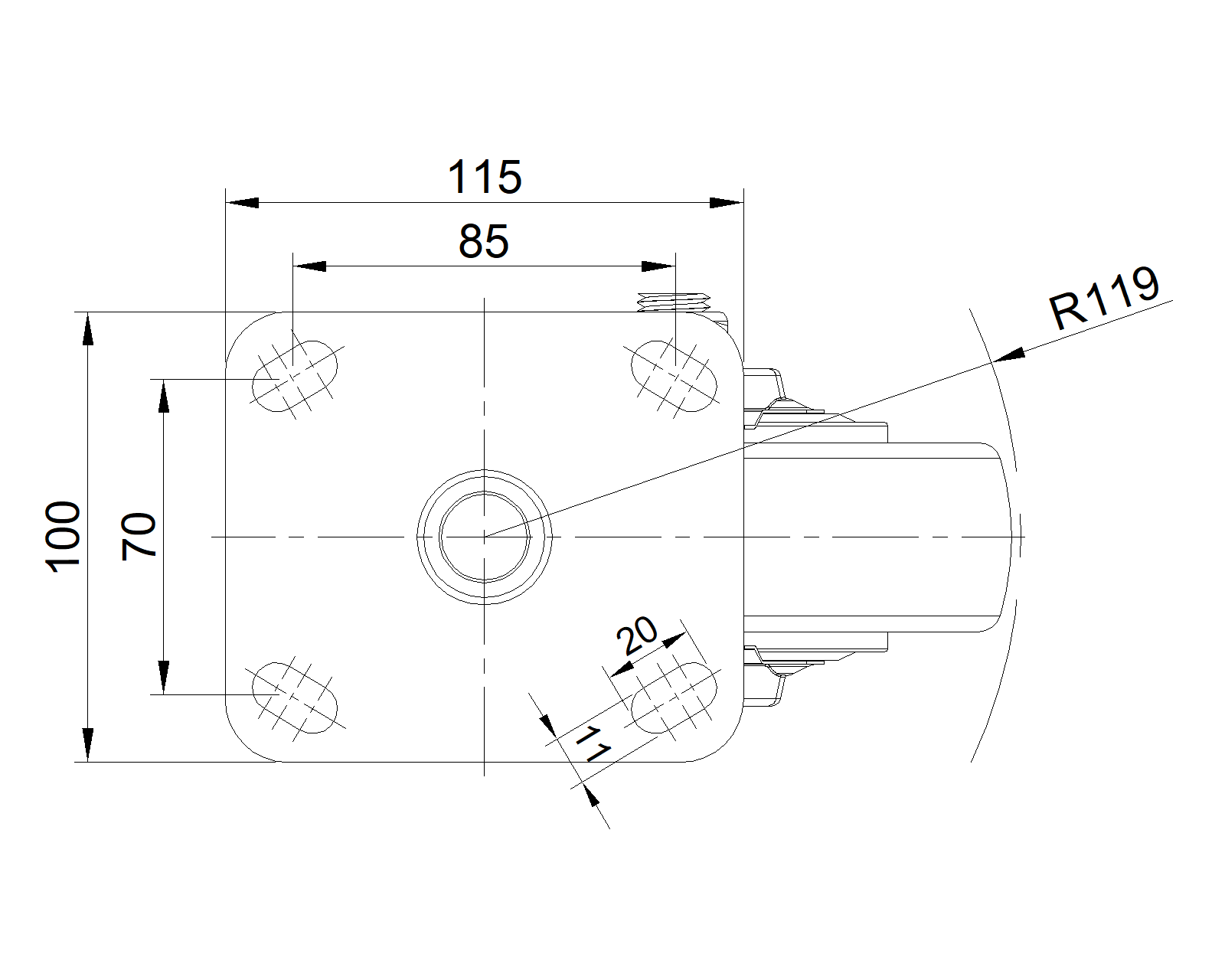 Quy cách tấm lắp 115 x 100mm khoảng cách các lỗ trên tấm nền 85 x 70mm Khoảng cách các lỗ lắp 20 x 11mm Độ lệch tâm 42mm Sự can thiệp quay 238mm Tổng chiều cao 191mm Bán kính xoay 119mm Độ cứng 87±5° Shore A Tải trọng (động) 670kgs |