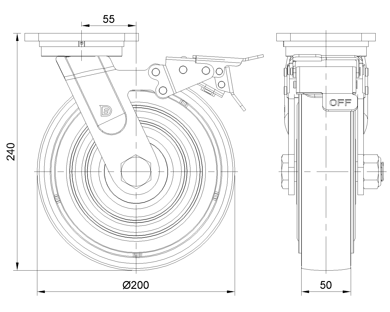 Quy cách tấm lắp 115 x 100mm khoảng cách các lỗ trên tấm nền 85 x 70mm Khoảng cách các lỗ lắp 20 x 11mm Độ lệch tâm 55mm Sự can thiệp quay 376mm Tổng chiều cao 240mm Bán kính xoay 188mm Độ cứng 92±5° Shore A Tải trọng (động) 670kgs |