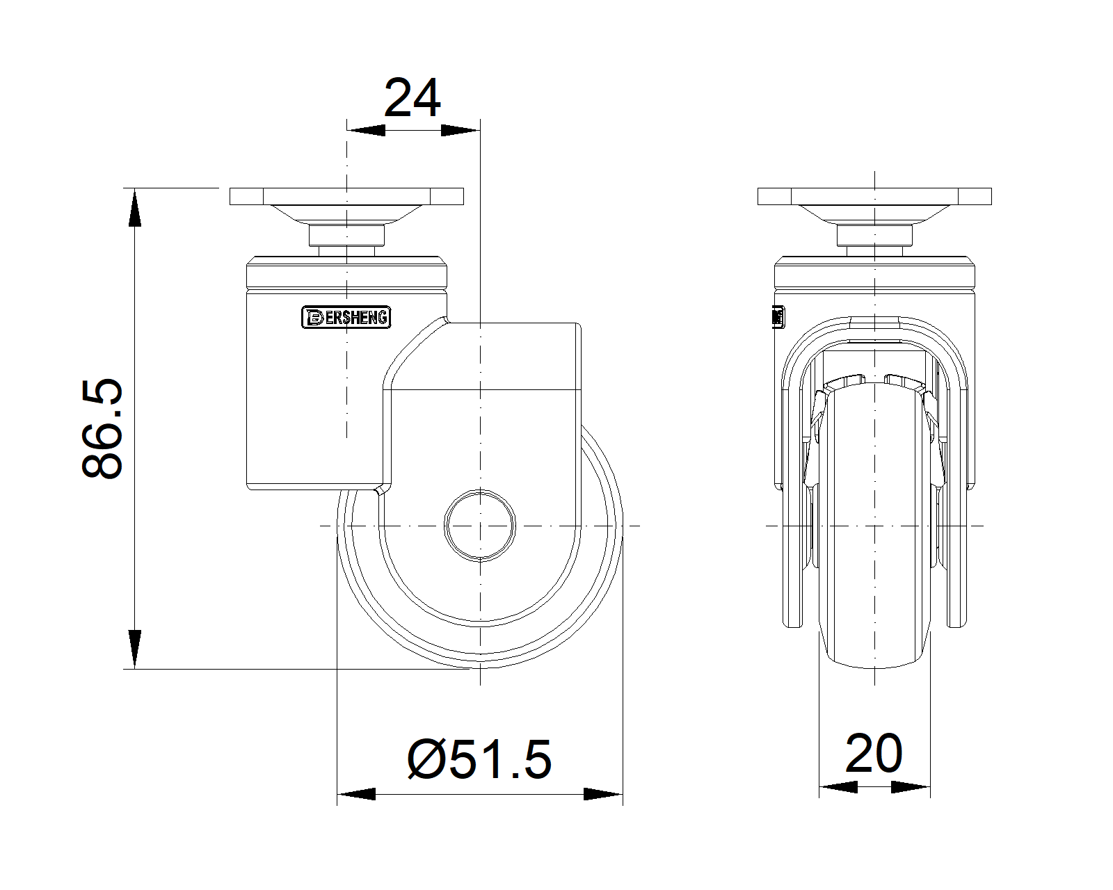 | PPR Bánh xe (đen) Đường kính bánh xe × Chiều rộng bánh xe 51,5 x 20mm |