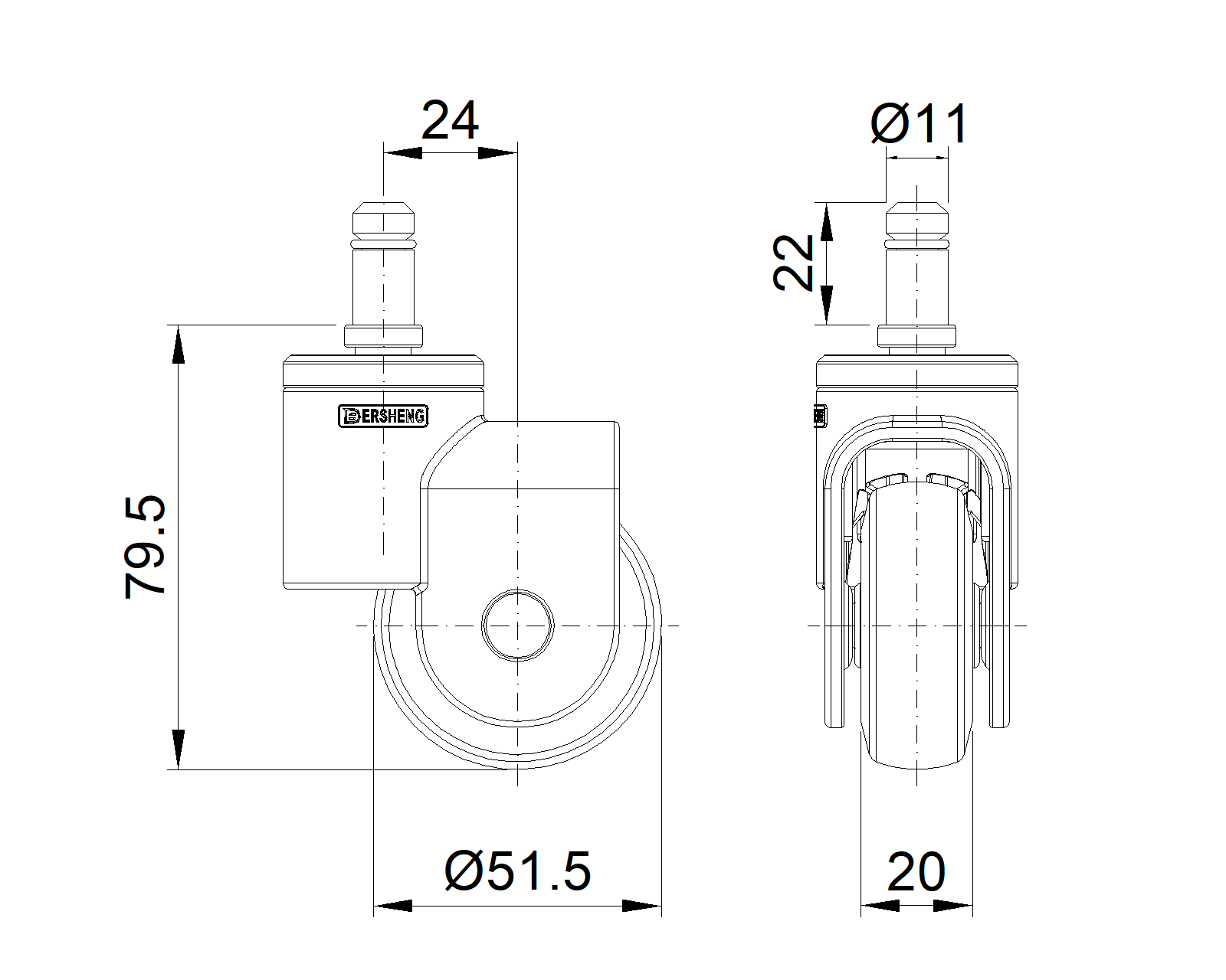 | PPR Bánh xe (đen) Đường kính bánh xe × Chiều rộng bánh xe 51,5 x 20mm |
