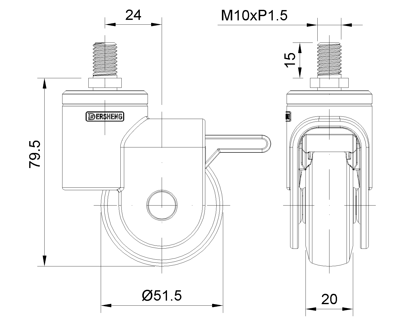 | Bánh xe khóa đơn, phanh đơn, ren M10x15.