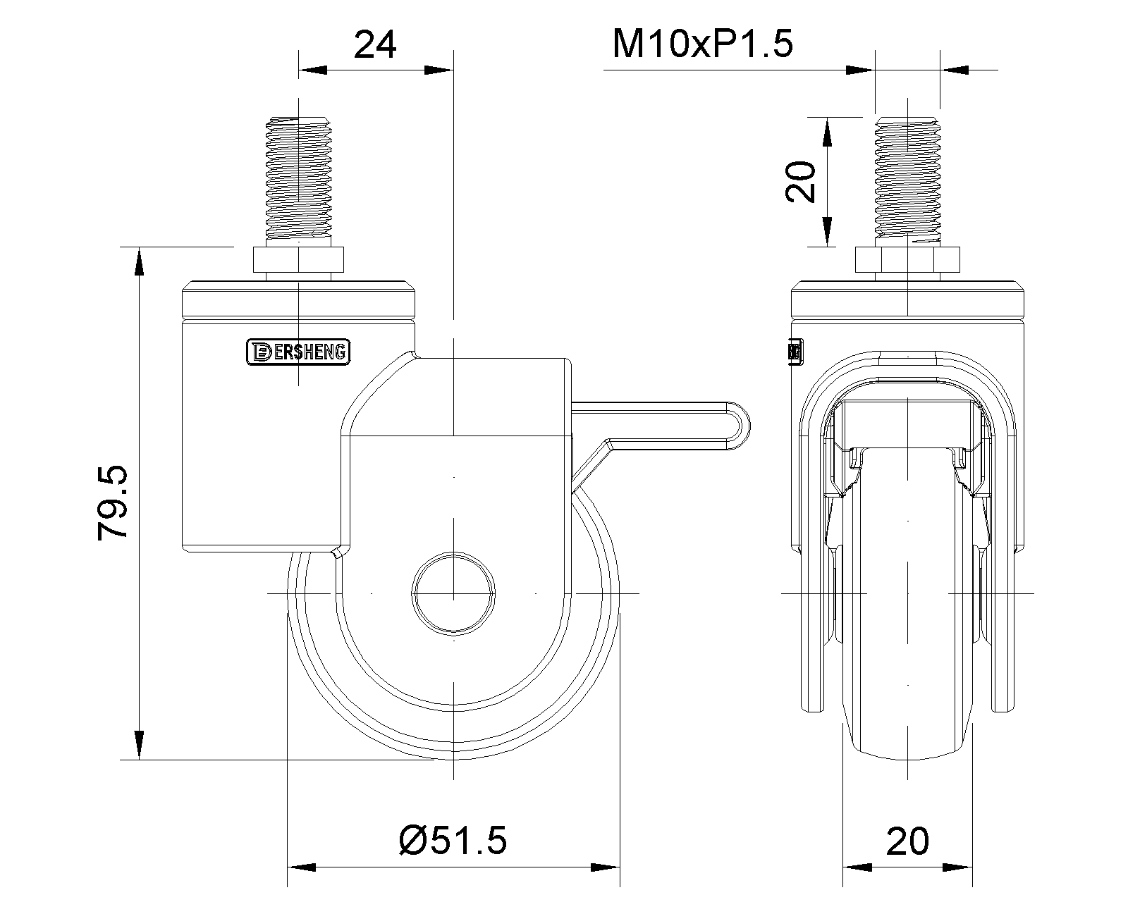 | Bánh xe khóa đơn, phanh đơn, ren M10x20.