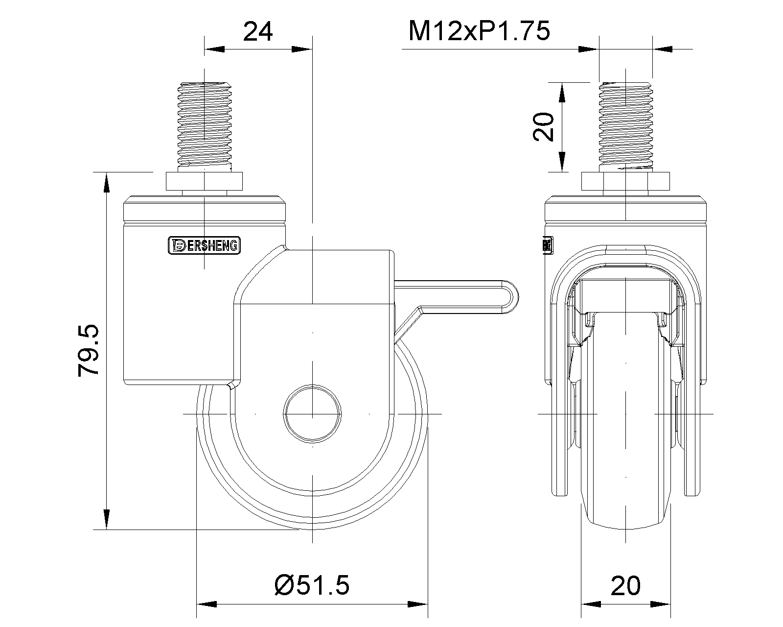 | Bánh xe khóa đơn, phanh đơn, ren M12x20.