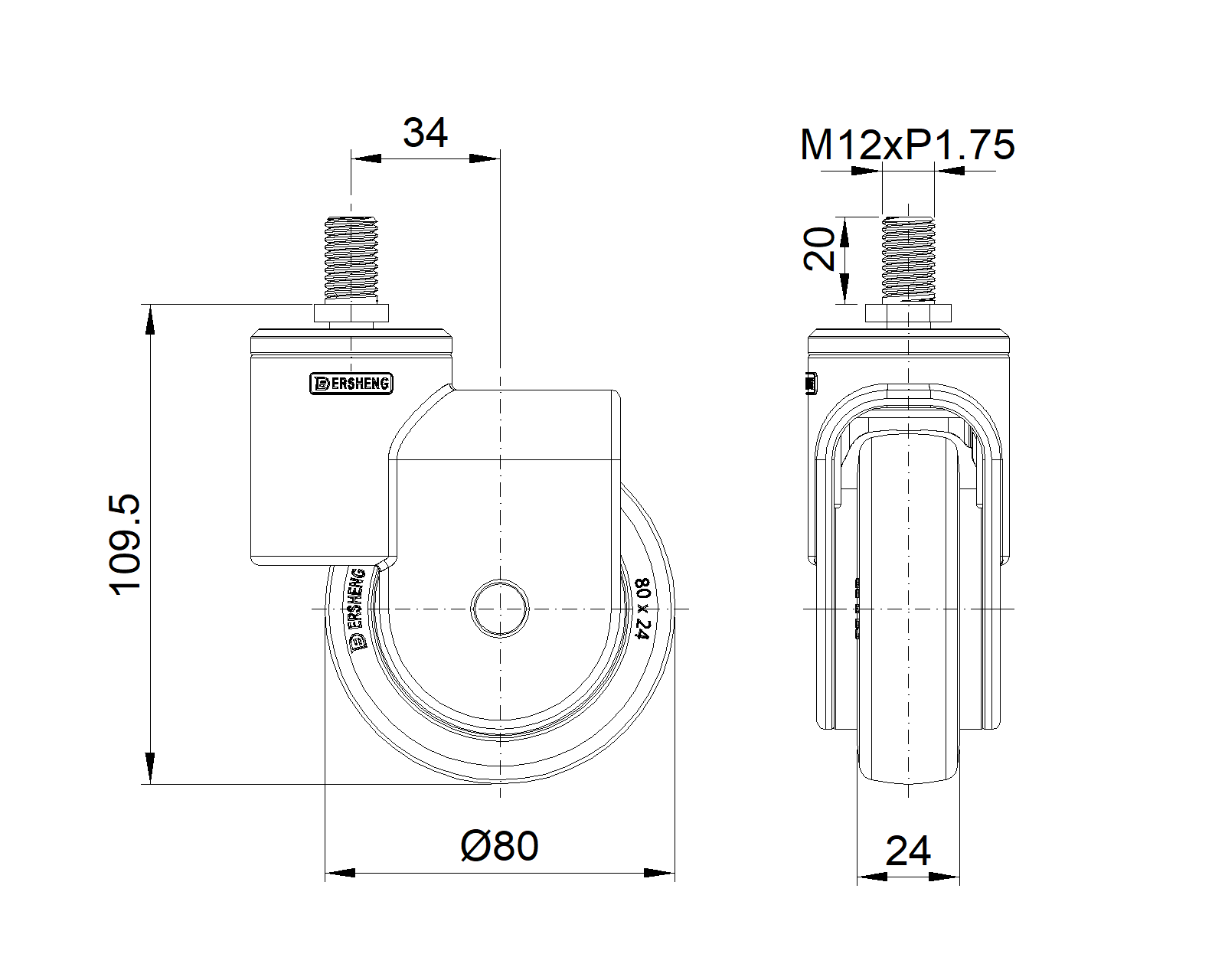 | Bánh xe xoay, ren M12x20