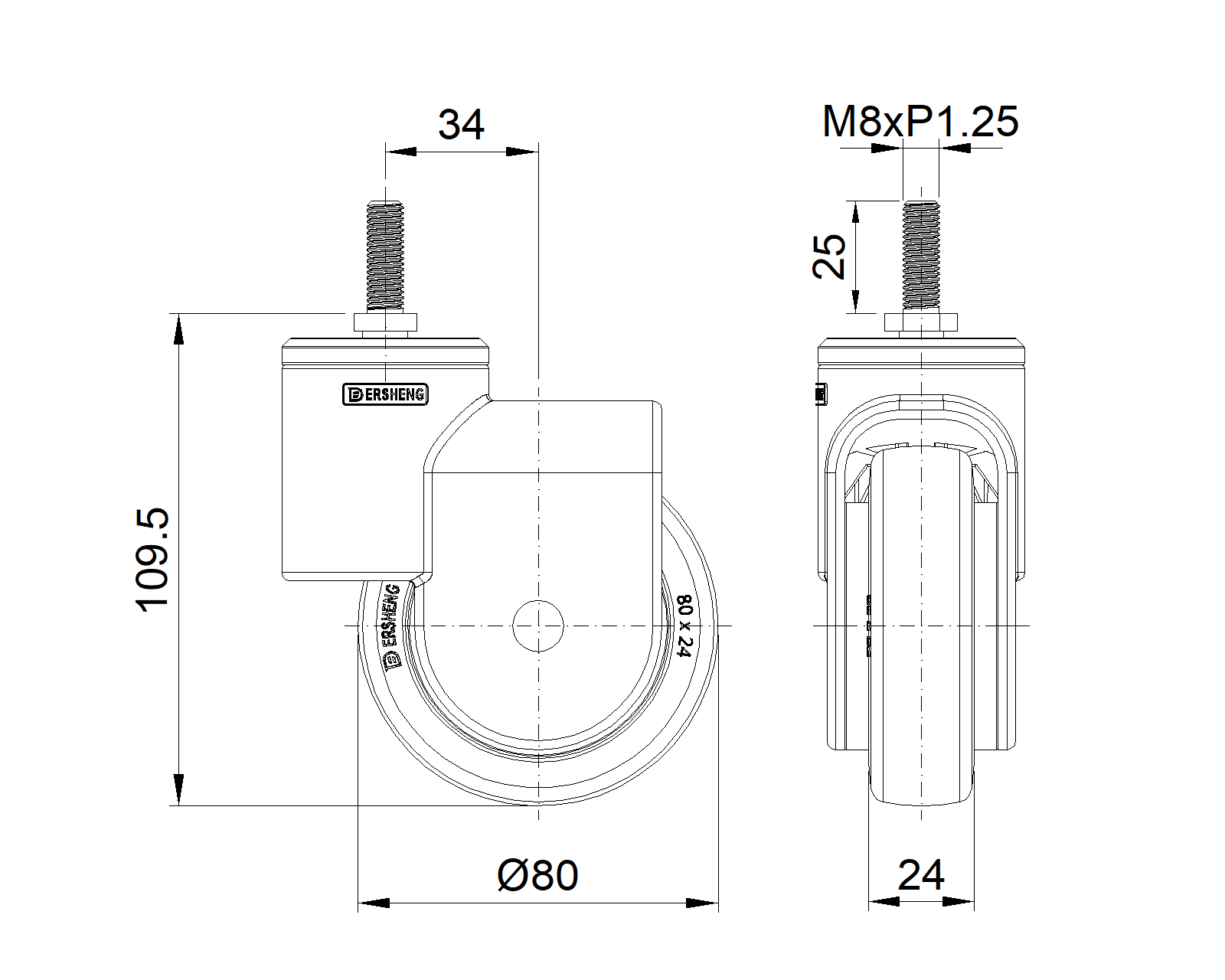 | Bánh xe xoay, ren M08x25
