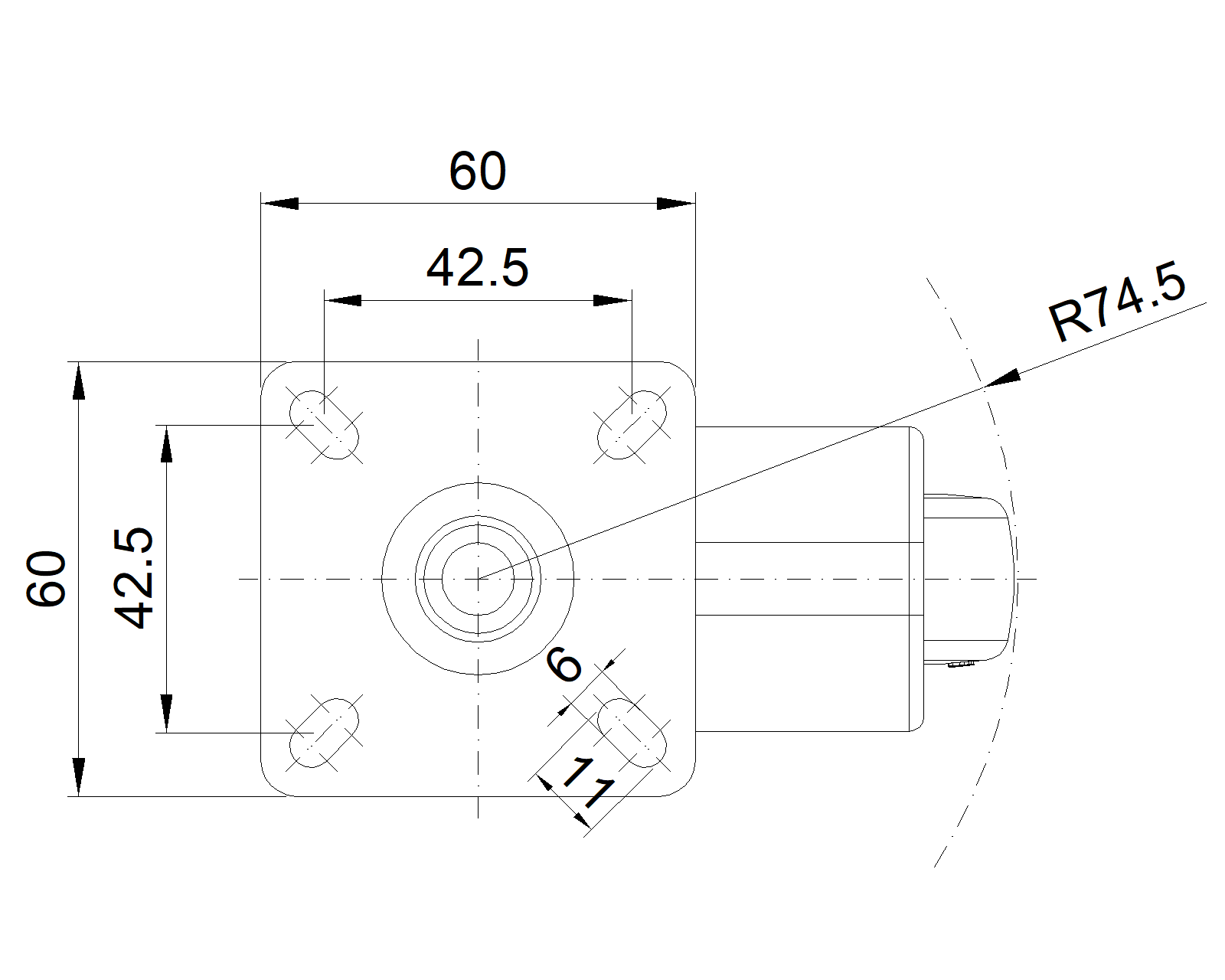 | Bánh xe xoay với đế lỗ góc 42,5 x 42,5 mm.