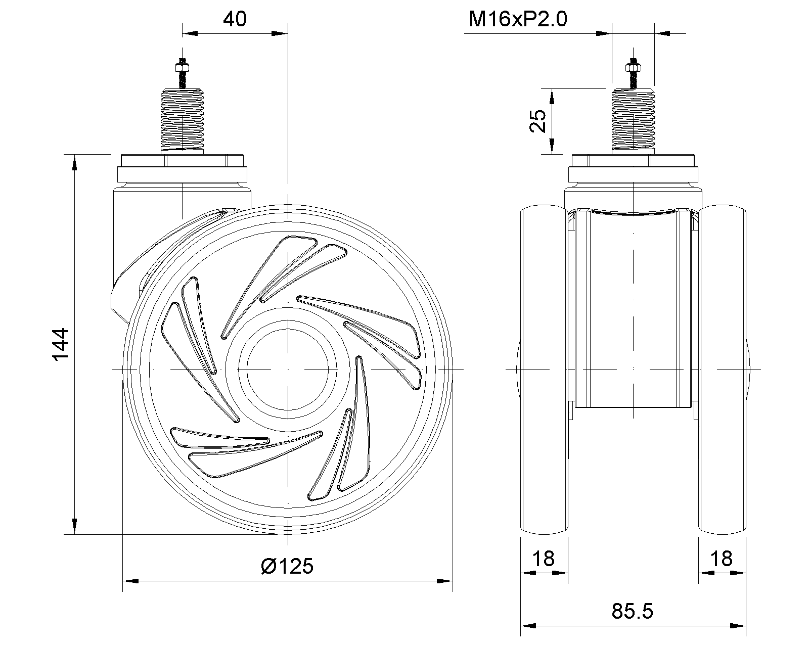 | Bánh xe xoay, ren M16x25 Khung màu trắng với lớp gia cố polyamide Chống gỉ, chống ăn mòn, thẩm mỹ, tiết kiệm và linh hoạt Lõi polypropylene chống va đập với gai nhựa nhiệt dẻo đàn hồi (TPR) Vòng bi bánh xe màu trắng xám đậm—vòng bi chính xác |   | |||||