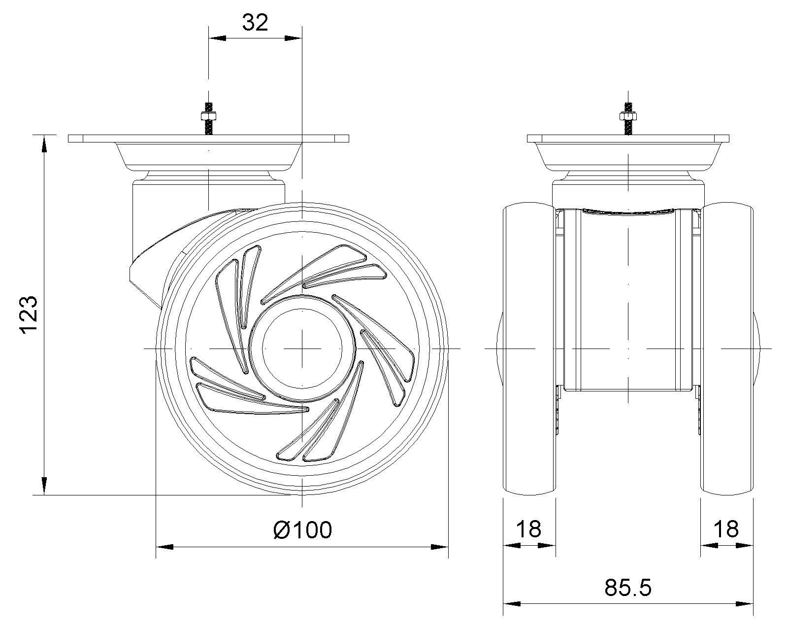 | Bánh xe có hệ thống phanh và khóa cố định, đế lỗ góc 75x45