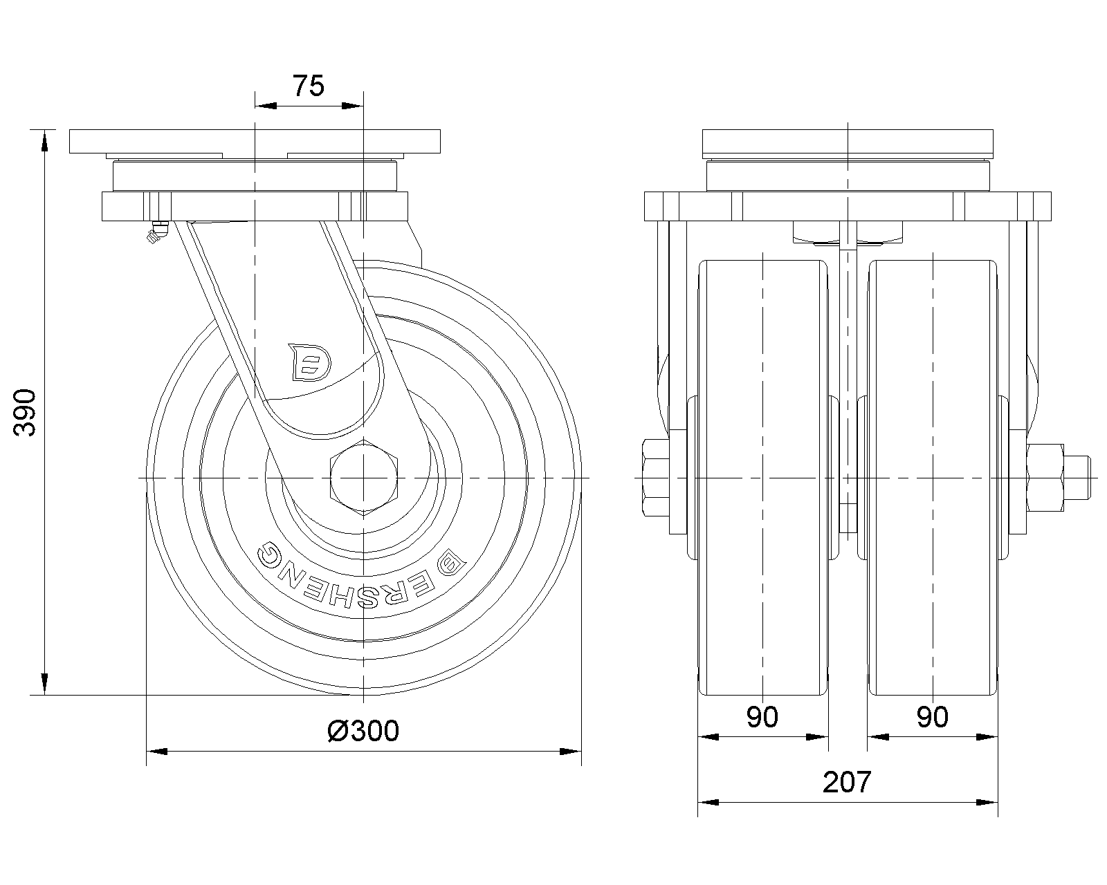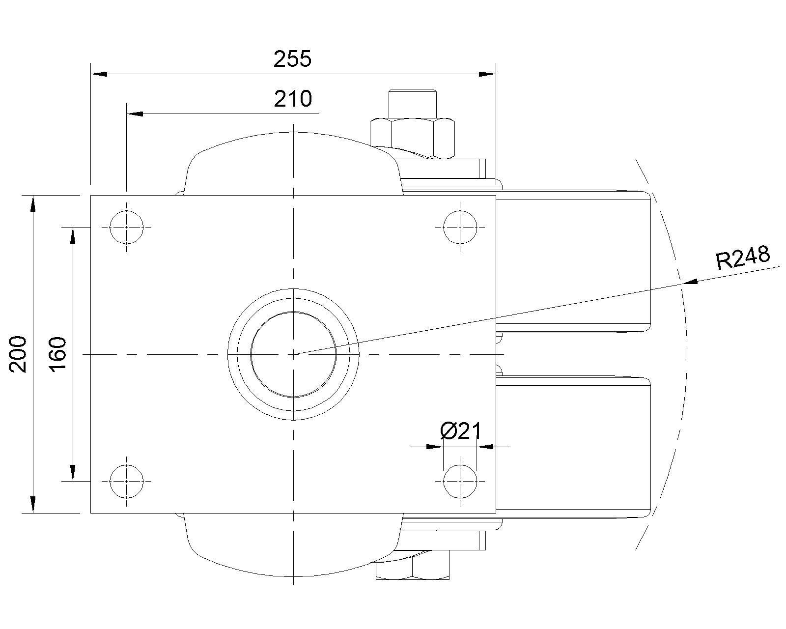底板式安装装置,孔距210x160 铸铁制轮芯,高品质聚氨酯轮面,铣酒红色 轮子轴承—斜珠轴承 |