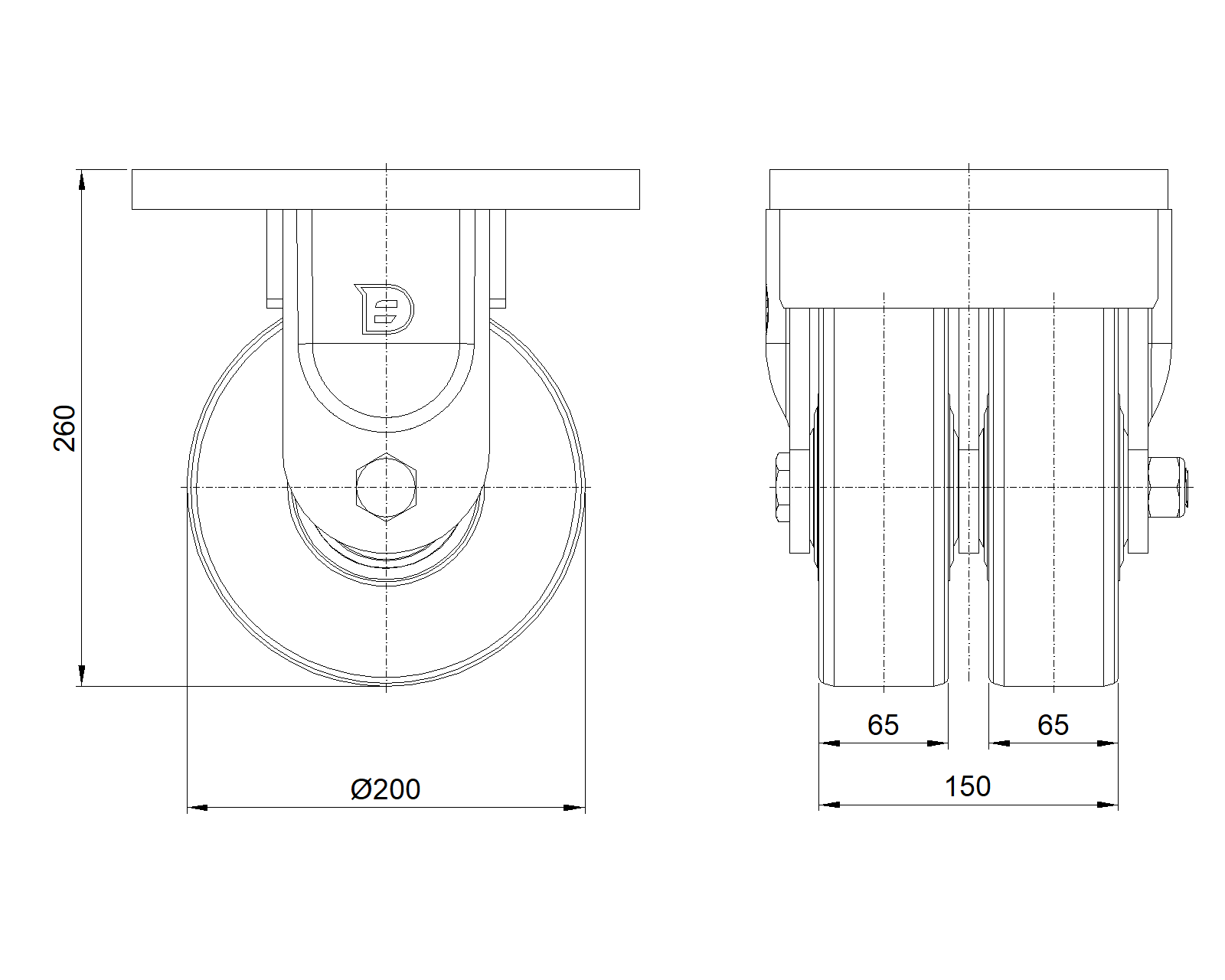 Lắp đế, khoảng cách lỗ 210x160 Lõi bánh xe và gai bánh xe bằng nhựa nhiệt dẻo, màu trắng ngà Vòng bi bánh xe – vòng bi góc |