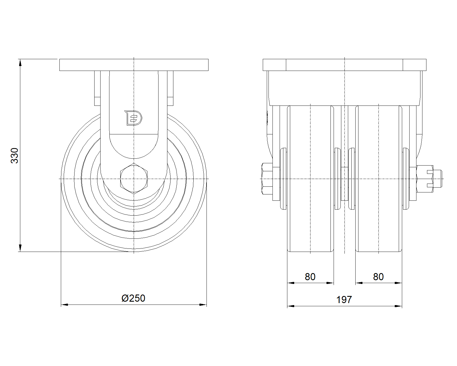 | Bánh xe cố định với khung thép hàn, sơn màu xanh Lắp đế, khoảng cách lỗ 210x160 Lõi bánh xe bằng gang với gai polyurethane chất lượng cao, phay màu nâu Vòng bi bánh xe - vòng bi góc |   | |||||