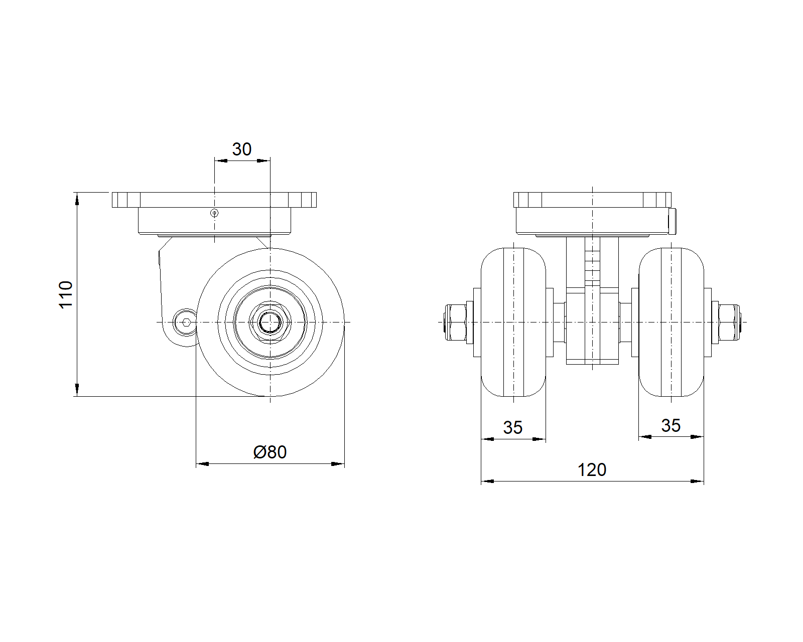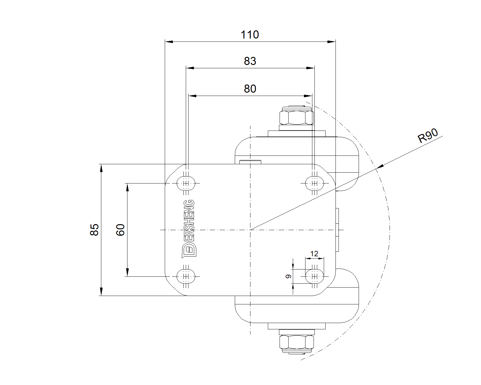 底板规格 110 x 85mm 底板孔距 80 x 60mm 底板孔径 129mm 偏心距 30mm 旋转干涉 180mm 总高 110mm 旋转半径 90mm 硬度 92±5° Shore A 荷重(动态) 400kgs |