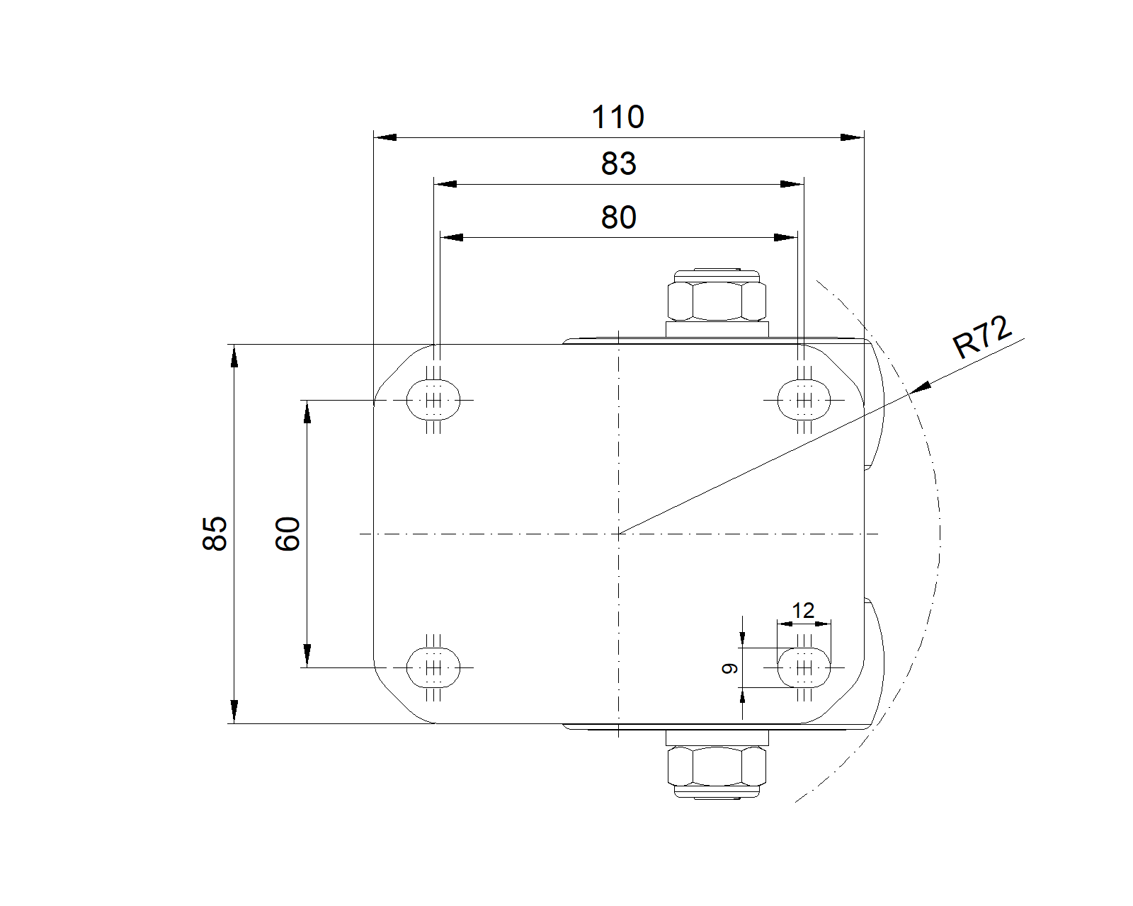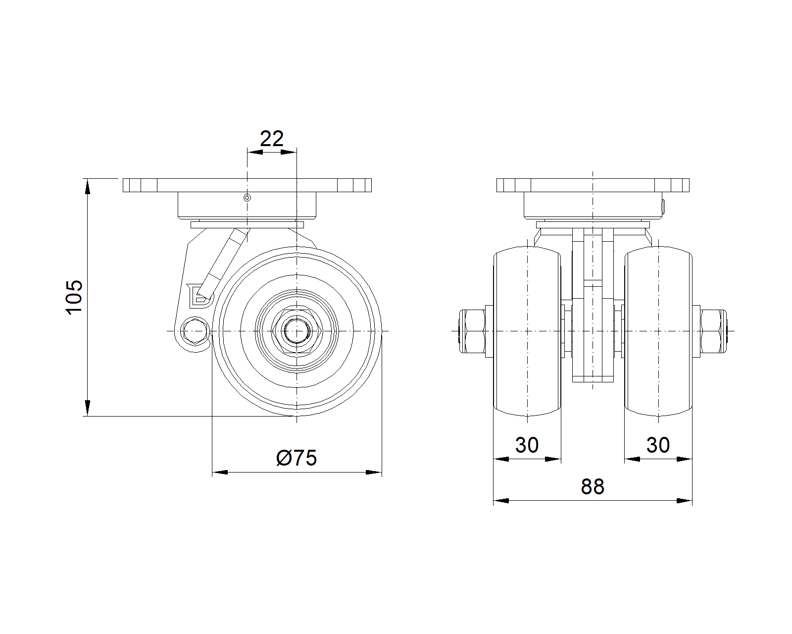 表面镀锌,底板式安裝裝置,孔距80x60 铸铁制轮芯,高品质聚氨酯轮面,铣褐色 轮子轴承—特制的精密滾珠,降低运转阻力 ZQPU双轮,符合人体工学,更容易启动及转动 |