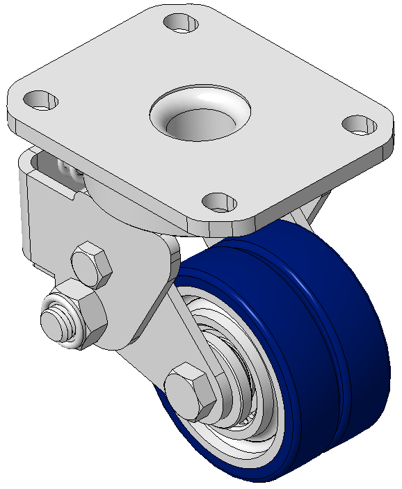 固定式弹簧加载脚轮,焊接钢板架 表面镀锌,底板式安裝,孔距80x60 铸铁制轮芯,高品质聚氨酯轮面,铣蓝色 轮子轴承—特制的精密滾珠,降低运转阻力 ZQPU双轮,符合人体工学,更容易启动及转动 |