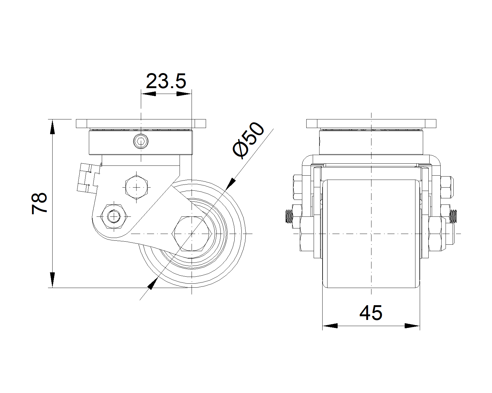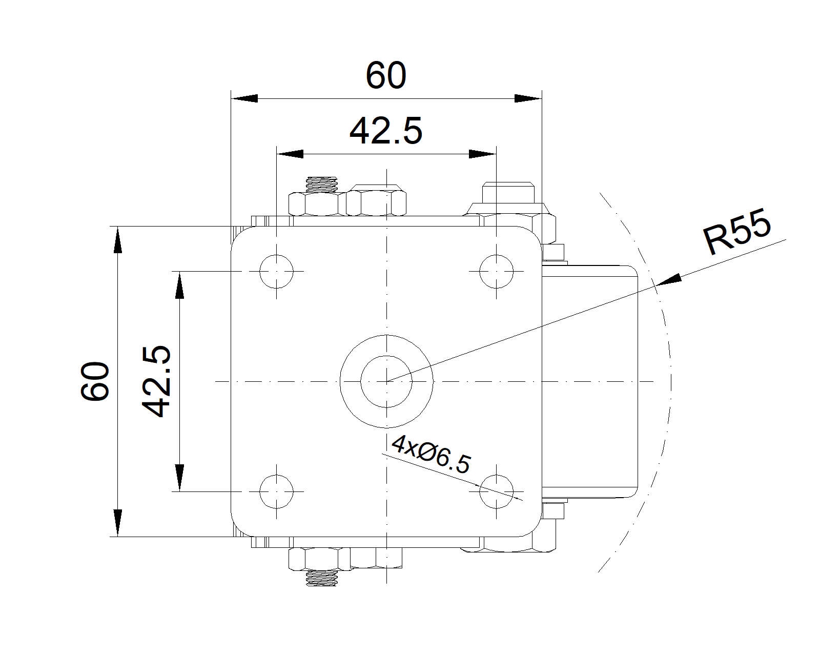 底板规格 60 x 60mm 底板孔距 42.5x42.5mm 底板孔径 6.5mm 偏心距 23.5mm 旋转干涉 110mm 总高 78mm 旋转半径 55mm 硬度 87±5° Shore A 荷重(动态) 50kgs |