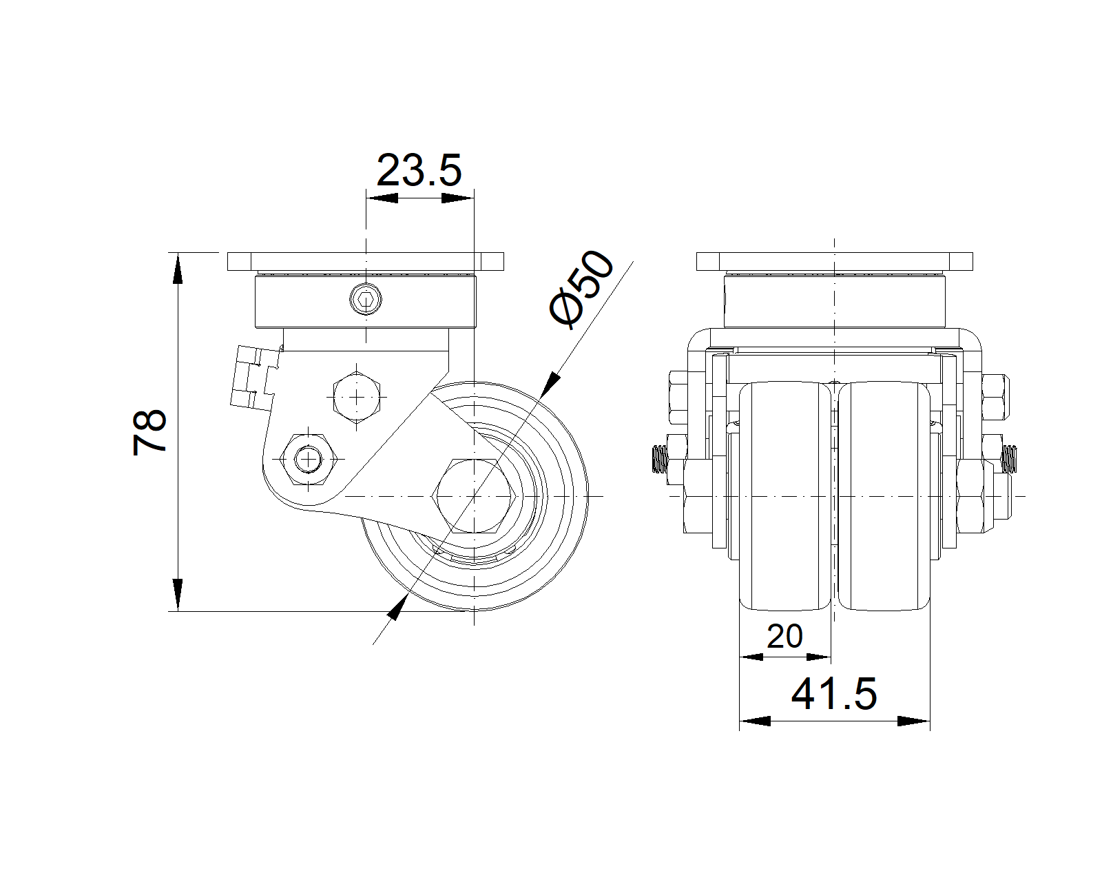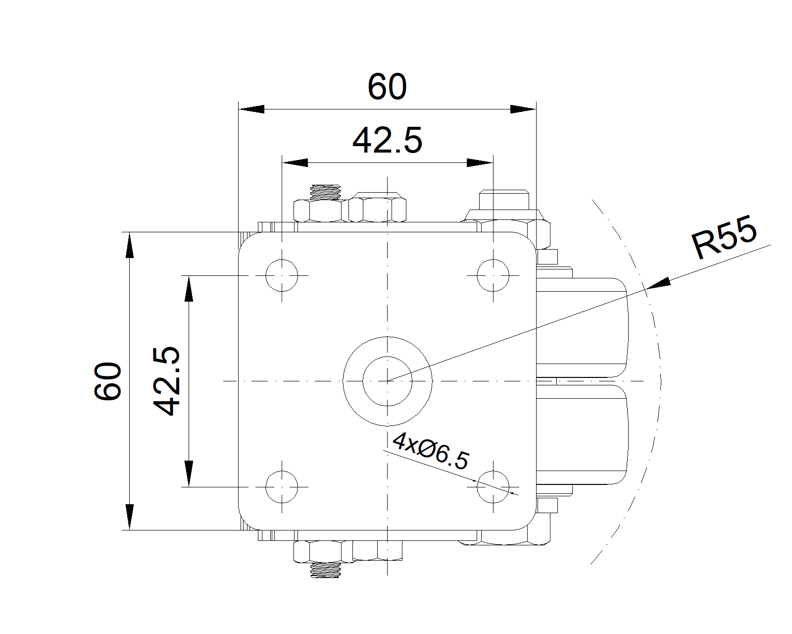 表面镀锌,底板式安装装置,孔距42.5x42.5 铸铁制轮芯,高品质聚氨酯轮面 铣蓝色,轮子轴承—精密滚珠 |