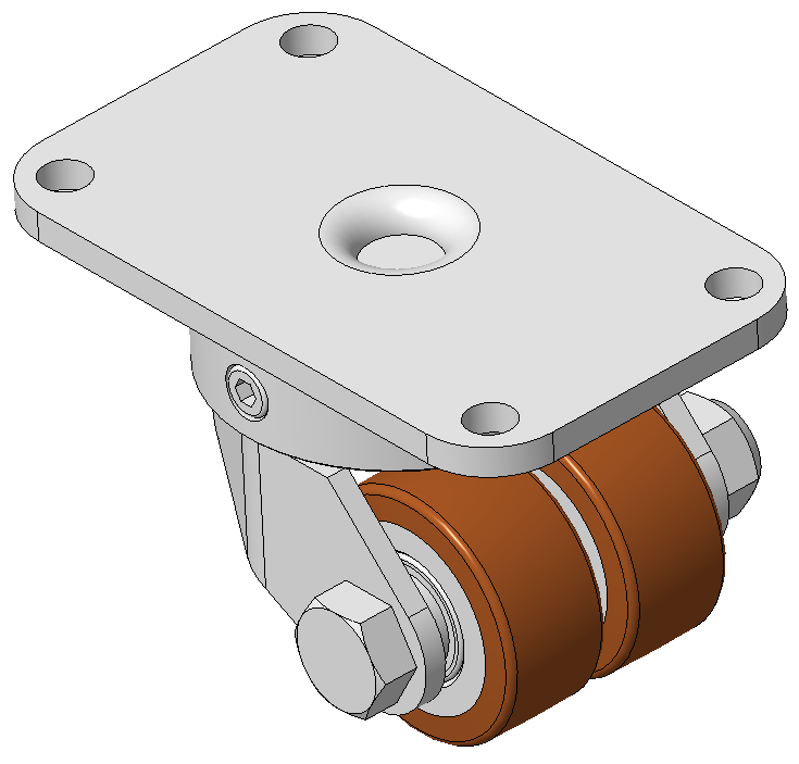 活动式脚轮,焊接钢板架,表面镀锌 底板式安裝裝置,孔距70x37 铸铁制轮芯,高品质聚氨酯轮面,铣褐色 轮子轴承—特制的精密滾珠,降低运转阻力 ZQPU双轮,符合人体工学,更容易启动及转动 |