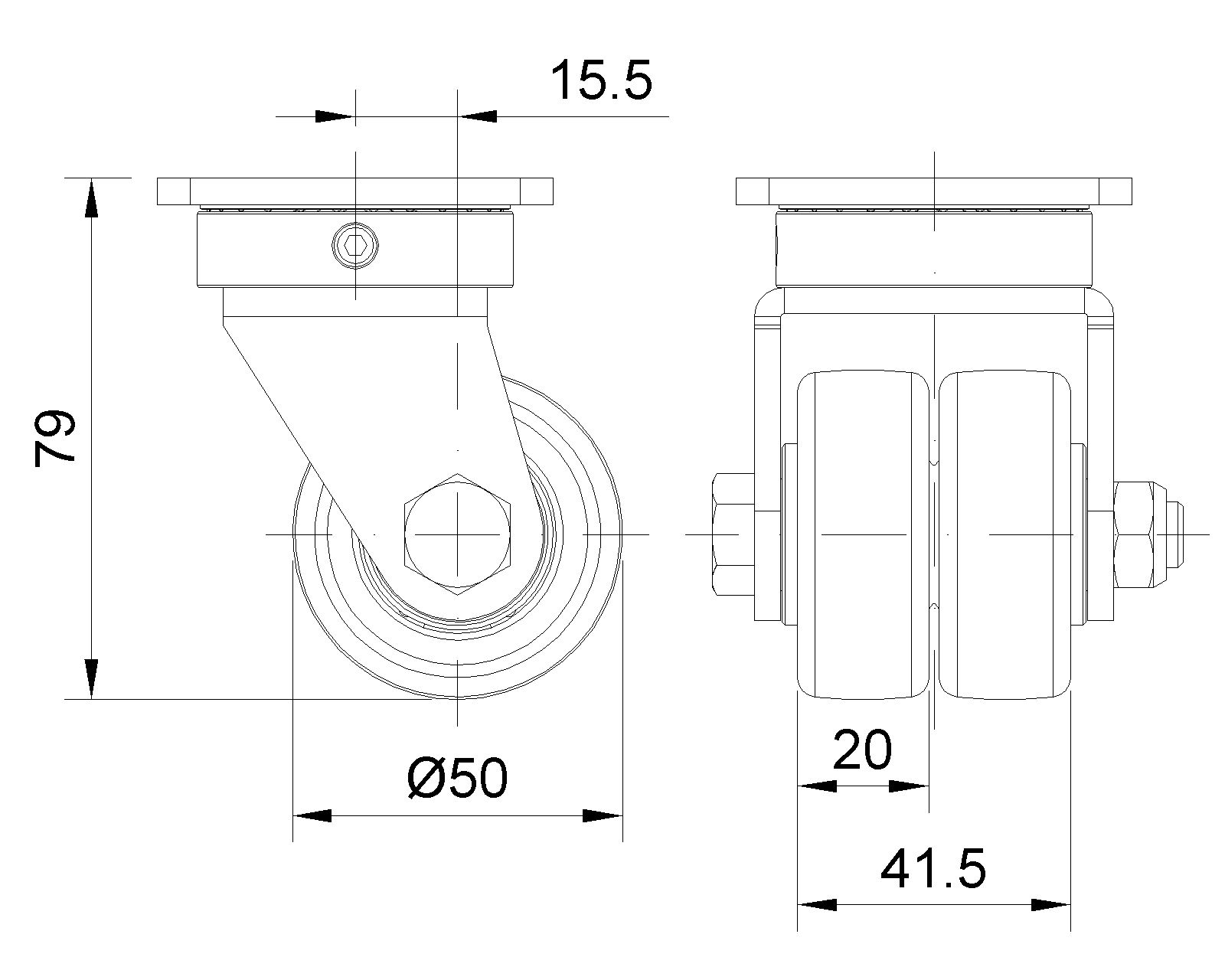 活动式脚轮,焊接钢板架,表面镀锌 底板式安裝裝置,孔距42.5x42.5 铸铁制轮芯,高品质聚氨酯轮面,铣蓝色 轮子轴承—特制的精密滾珠,降低运转阻力 ZQPU双轮,符合人体工学,更容易启动及转动 |