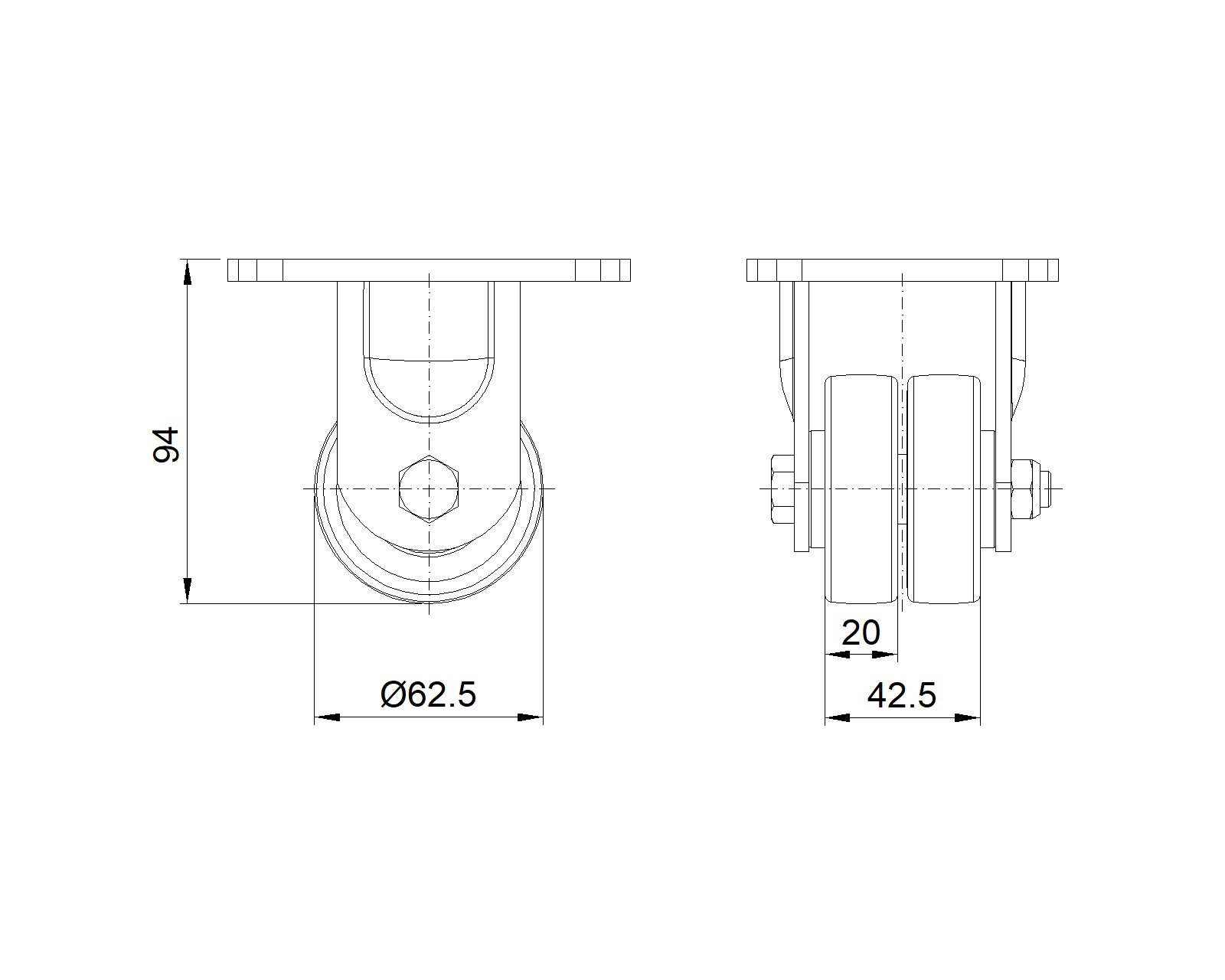 表面电镀,底板式安裝裝置,孔距80x60 铸铁制轮芯,高品质聚氨酯轮面,铣黑色 轮子轴承—特制的精密滾珠,降低运转阻力 ZQPU双轮,符合人体工学,更容易启动及转动 |