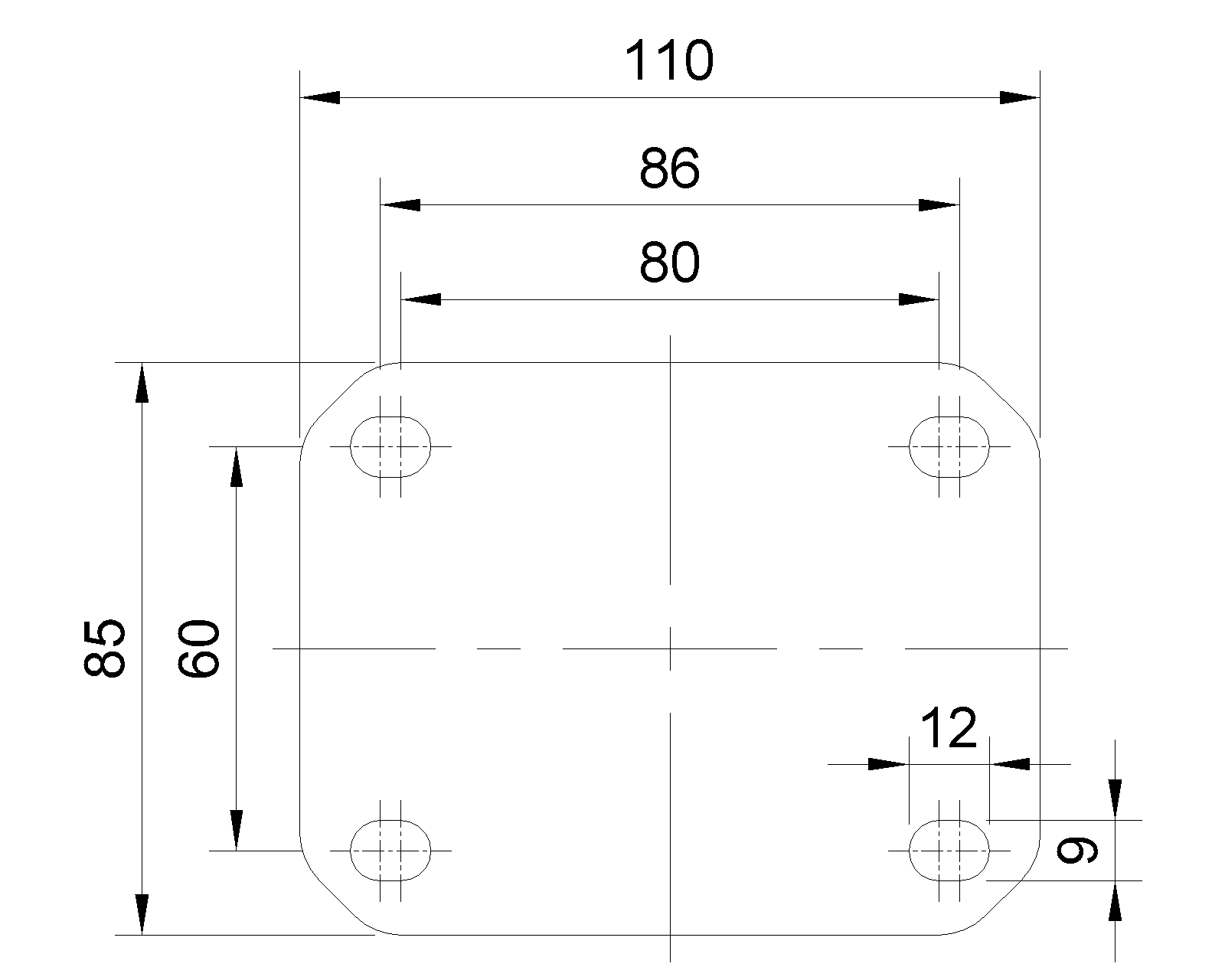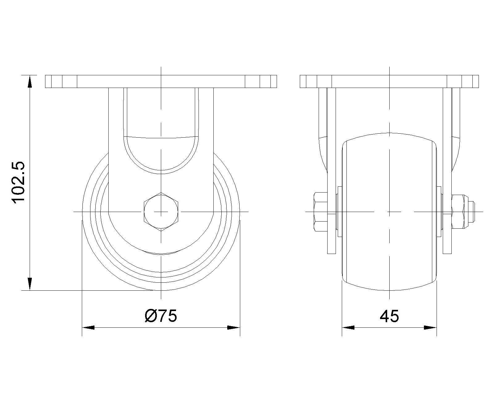 固定式脚轮,焊接钢板架,表面镀锌 底板式安装装置,孔距80x60 铸铁制轮芯,高品质聚氨酯轮面 铣褐色,轮子轴承—精密滚珠 |