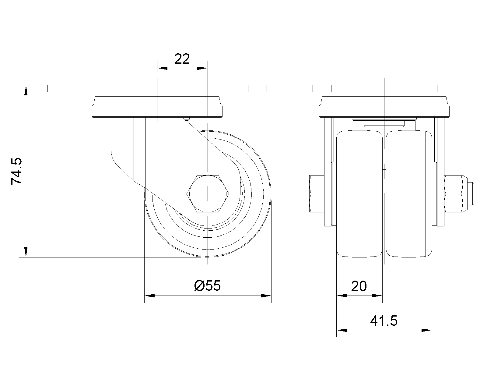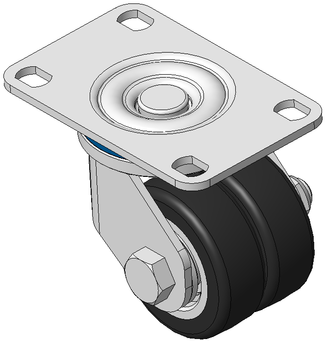 活动式脚轮,焊接钢板架,表面电镀 底板式安裝裝置,孔距75X45 铸铁制轮芯,高品质聚氨酯轮面,铣黑色 轮子轴承—特制的精密滾珠,降低运转阻力 ZQPU双轮,符合人体工学,更容易启动及转动 |