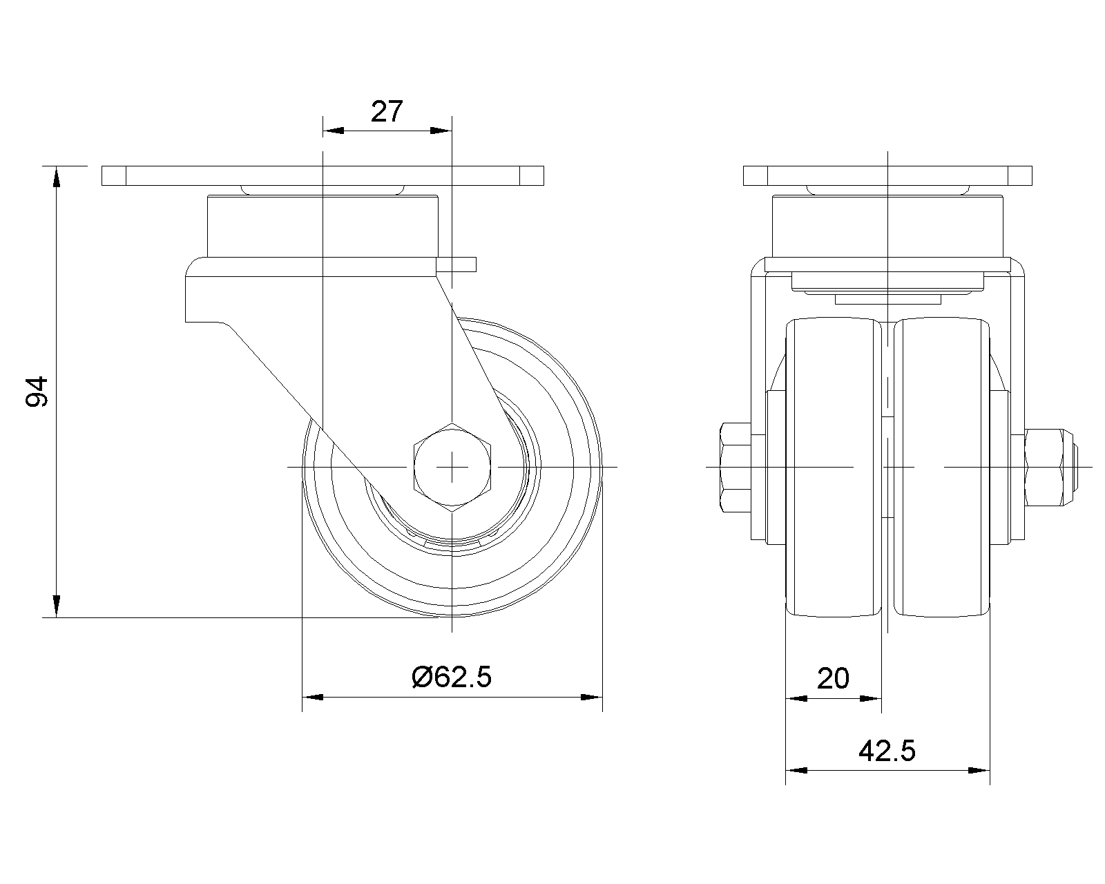 | 抗静电ZQPU轮(铣黑)轮径×轮宽 62.5x 20(41.5)mm |